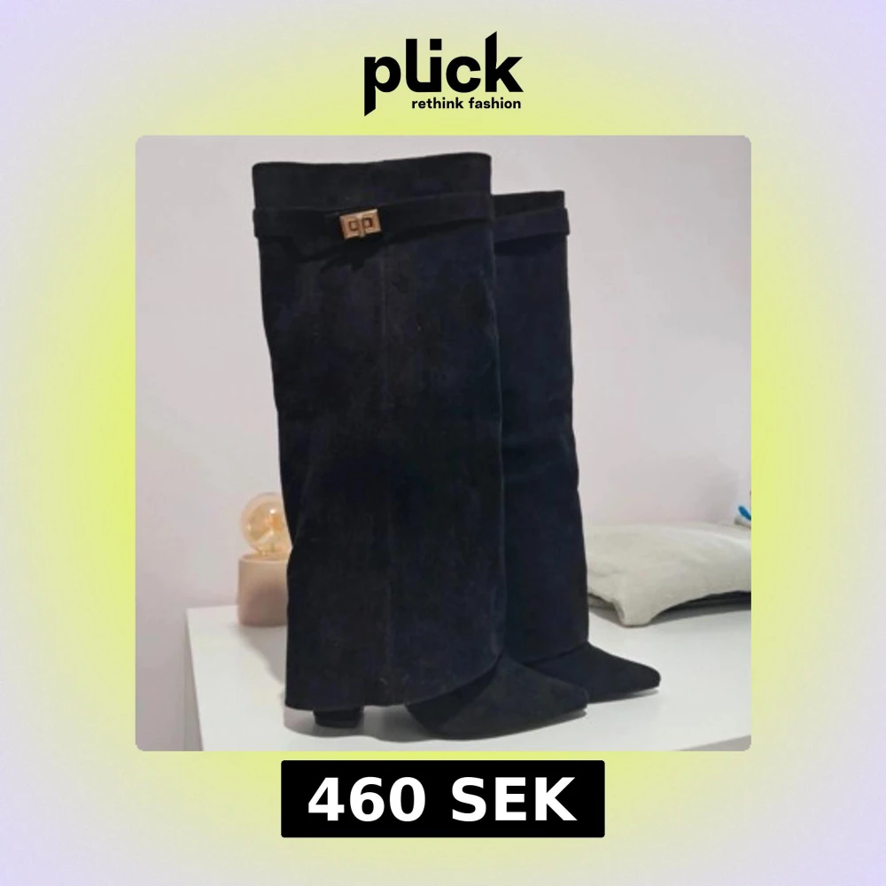 Eleganta svarta stövlar i mocka med spetsig tå och klack. De har en dekorativ spänne och dragkedja på sidan för enkel på- och avtagning.