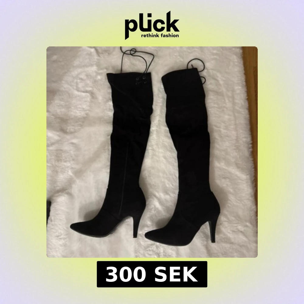 Snygga svarta overknee boots med spetsig tå och klack. De har snörning upptill och dragkedja längs sidan för enkel på- och avtagning. Perfekta för att ge en stilren look.