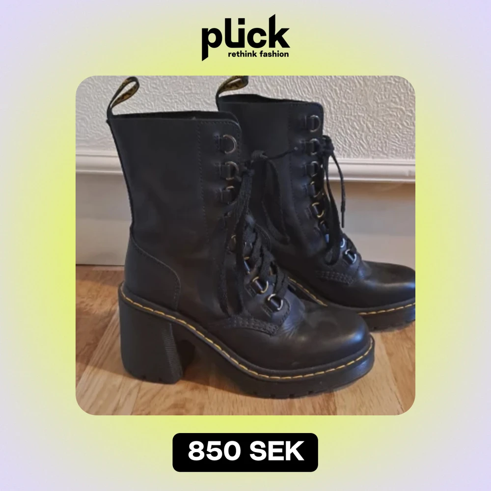 Säljer ett par svarta kängor i skinn med rejäl klack och snörning framtill. De har en cool gul söm runt sulan som ger en extra touch. Perfekta för höst och vinter, och de funkar lika bra till vardags som till fest! Orginalpris: 2300kr Säljer för: 850kr + frakt