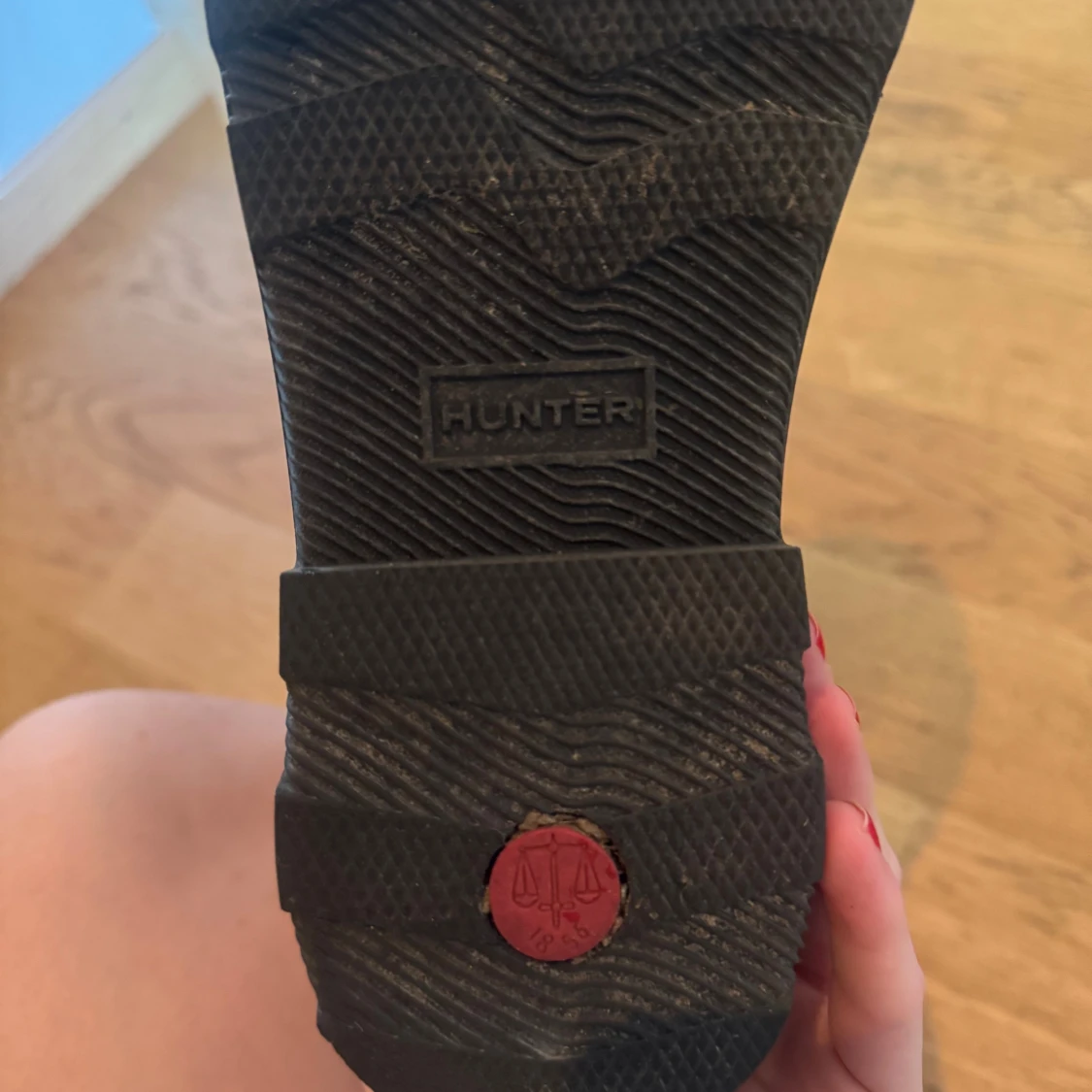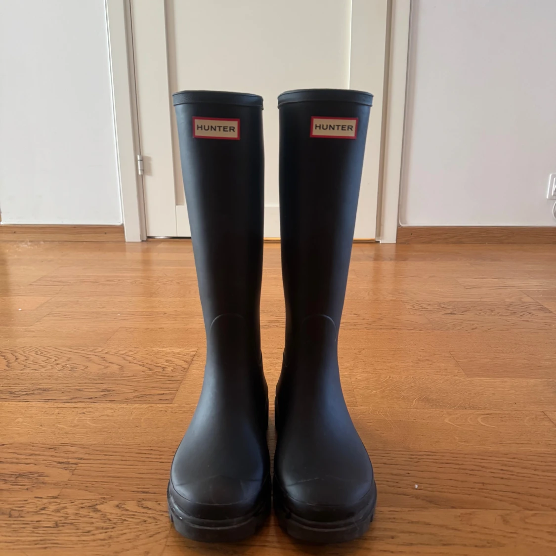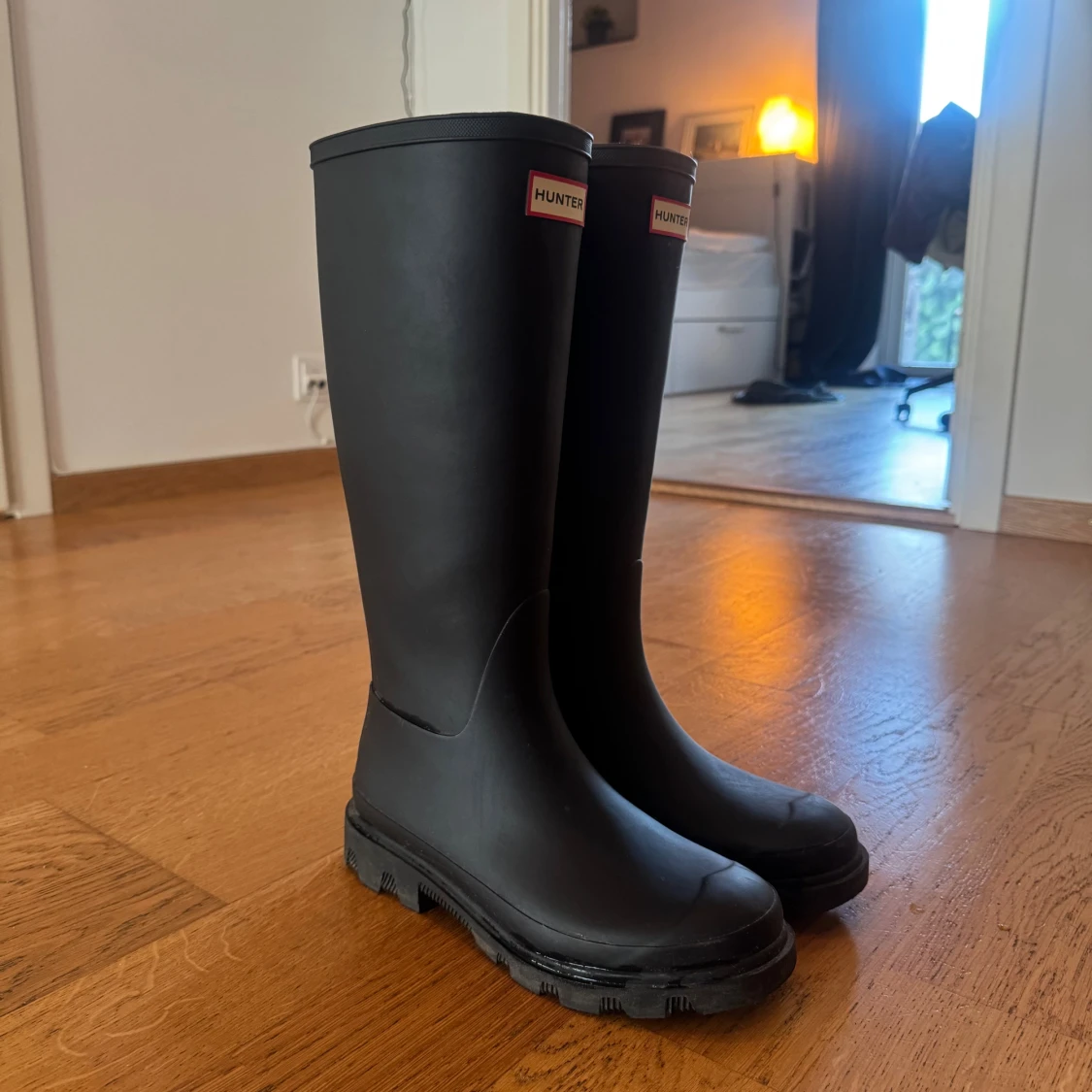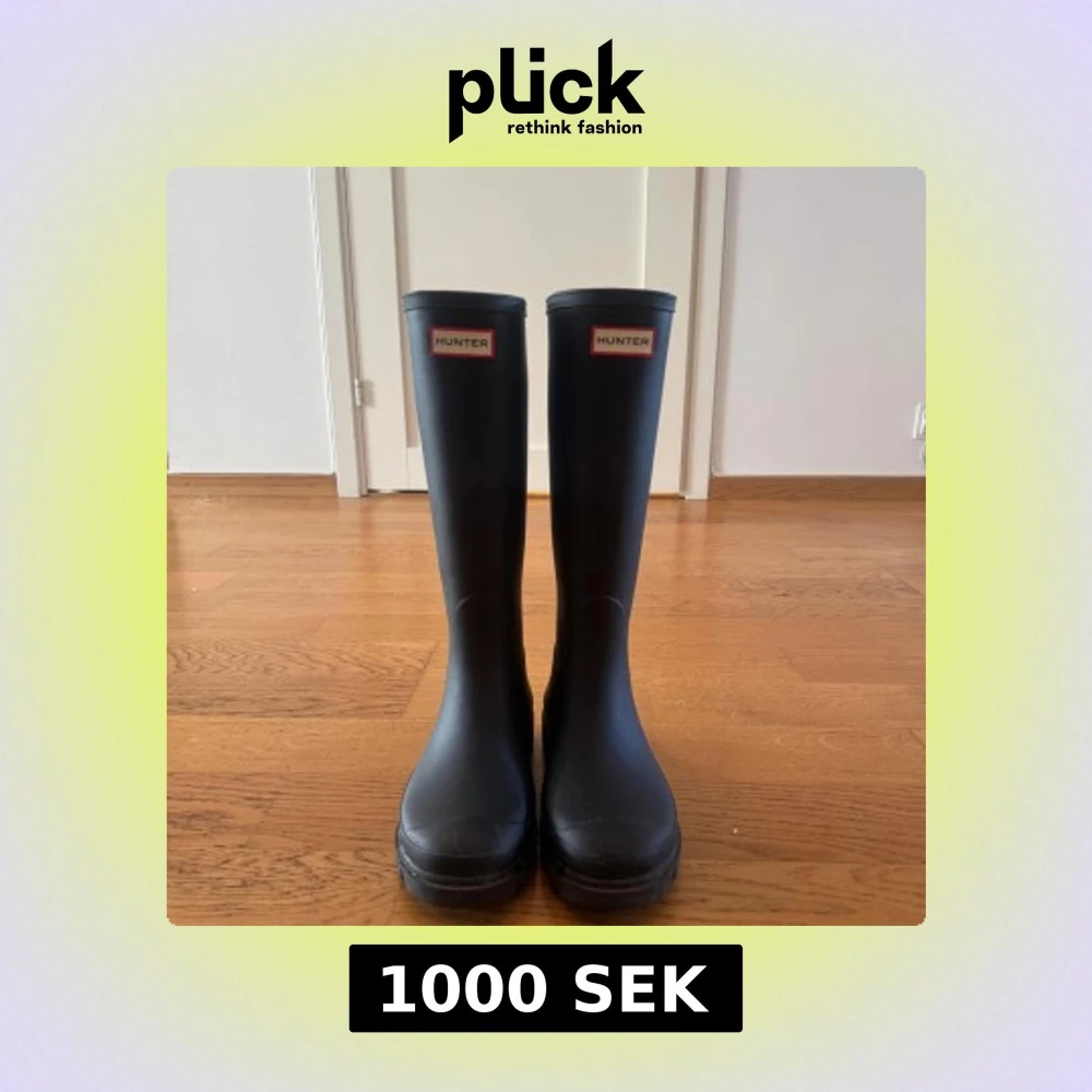 Klassiska svarta höga stövlar från Hunter med logga framtill. Tillverkade i slitstarkt gummi med grov sula för extra grepp. Perfekta för regniga dagar och festivaler. Snygg, minimalistisk design som funkar till de flesta outfits. Perfekta nu till hösten! Använda 3 gånger så i princip helt nya. Köpta på NK för 1699