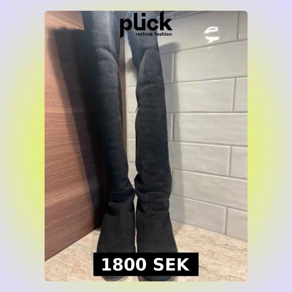 Snygga svarta stövlar i mocka med platt sula och rund tå. De är höga, går över knäet och har en dragkedja på insidan. Insidan är fodrad med pälsfoder för extra värme. Perfekta för kalla dagar och ger en stilren look till din outfit. Köpta på Blocket nyligen men var för små för mig ( jag är liten 37:a). Enl ägaren endast använda 1 ggn. Jag har endast provat dem inomhus. Nypris Marzio vintern -24, 7500kr. Fantastiska stövlar som passar en normal 36:a.