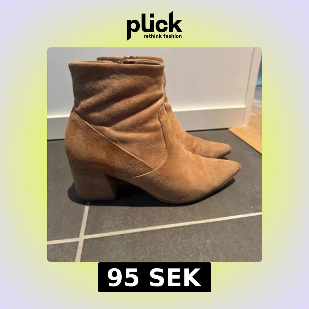 Snygga bruna stövletter i mjuk mocka med spetsig tå och stabil klack. Perfekt för dig som gillar en stilren look med lite edge. Dragkedja på insidan för enkel på- och avtagning. Passar till både jeans och klänning.