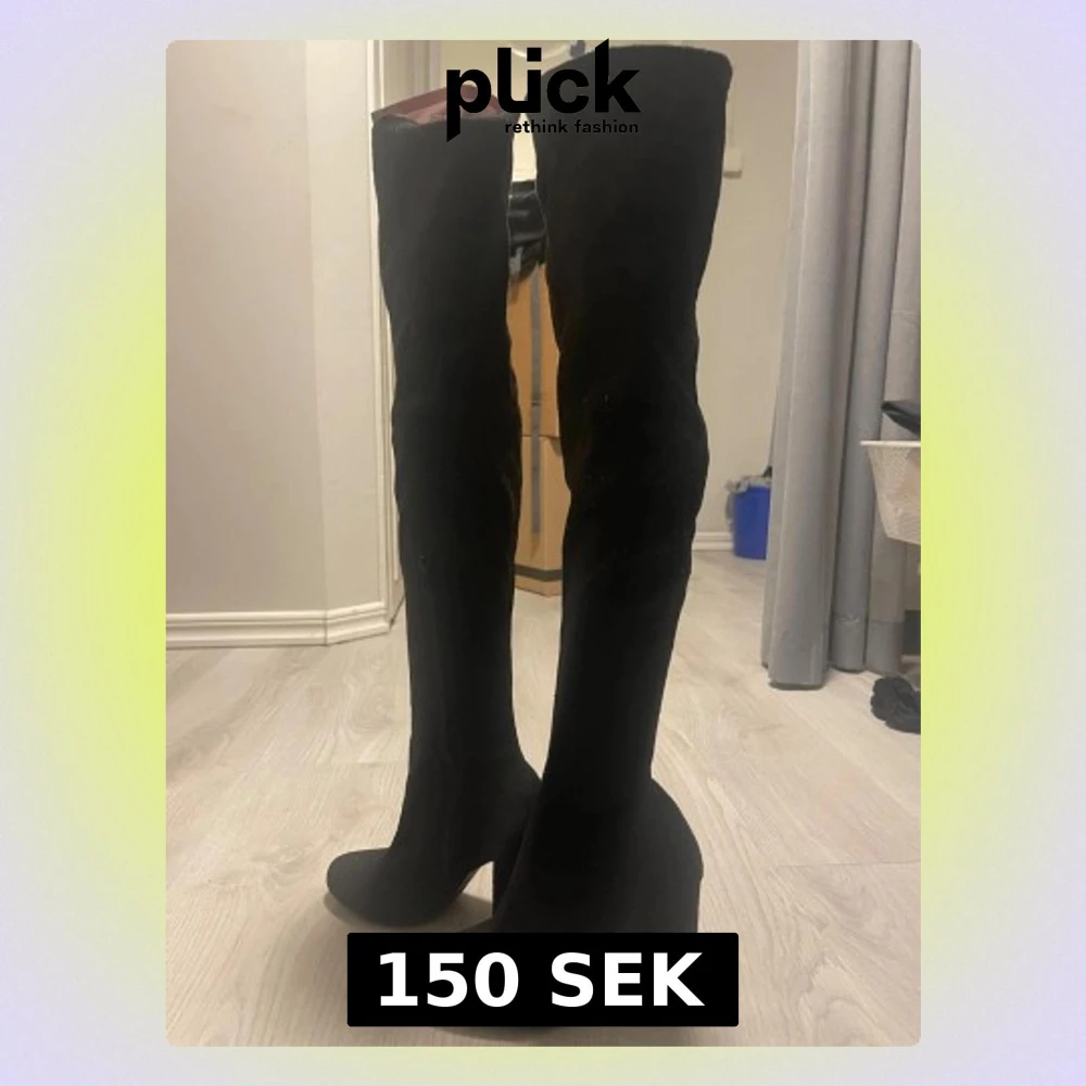 Säljer ett par svarta overknee boots med hög klack och rund tå. Skorna är gjorda i mjuk mocka och har en stilren, slimmad siluett som går upp över knäet. Perfekta för dig som vill ha en edgy look och gillar höga stövlar.har små stenar på sig som glittrar i sol ljus, klubb ljus och scen ljus även månsljus. Knappt använda om de används var det länge sen de användes uppstoppade med tidningar för att visa hur de ser ut tidningar följer med ska tvätta sulan innan jag skickar