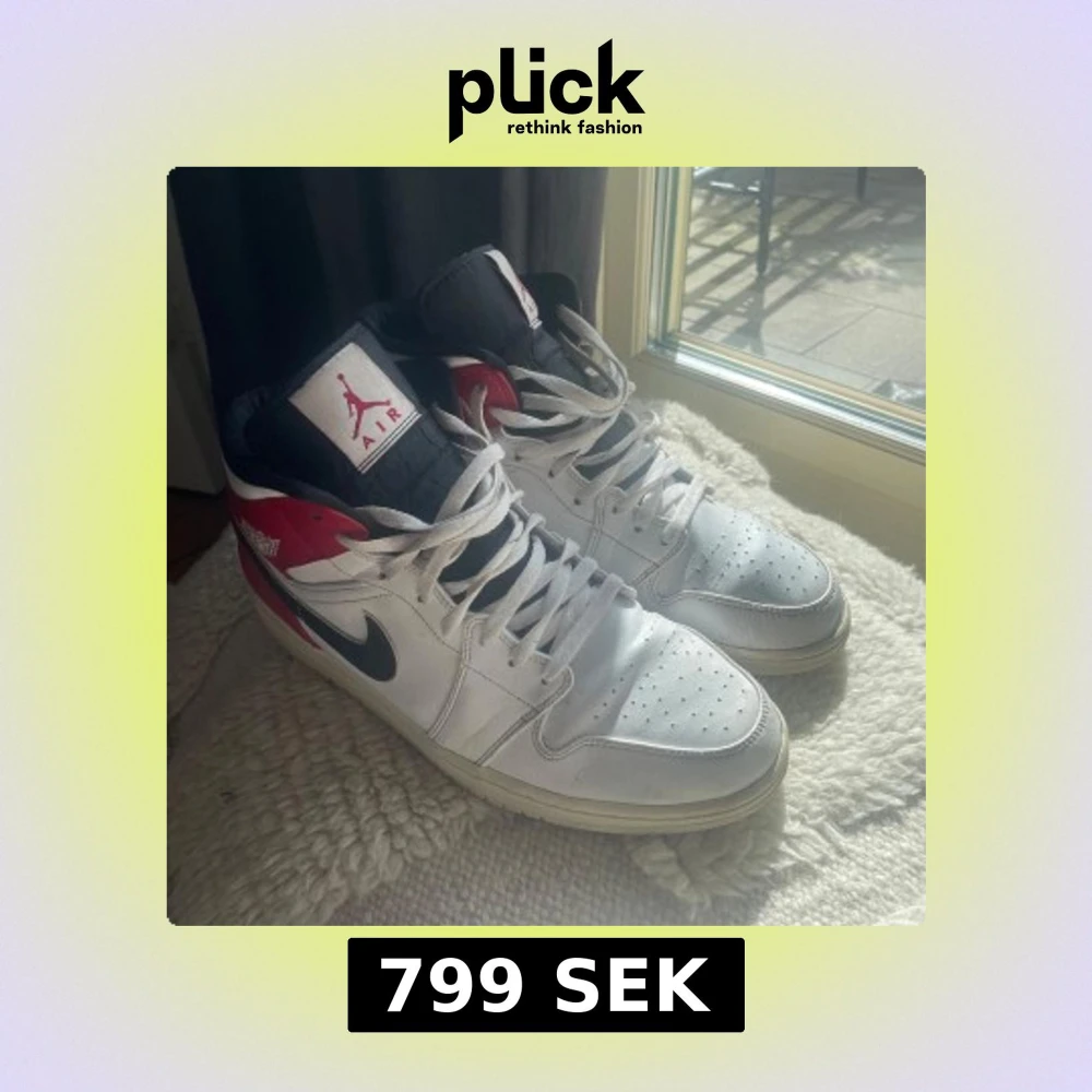 Säljer ett par Nike Air Jordan 1 Mid i klassisk vit, röd och svart färg. Skorna har svart swoosh, röd häl och vit ovandel i skinn. Perforerad tå, högt skaft och ikonisk Jumpman-logga på plösen. Perfekta för dig som gillar streetwear och sneakerskultur.