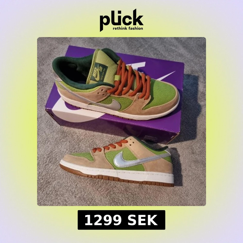 Nike SB Dunk Low escargot med grön textil, beige mockadetaljer och silvrig swoosh.. Kommer med originalkartong. Aldrig använd.