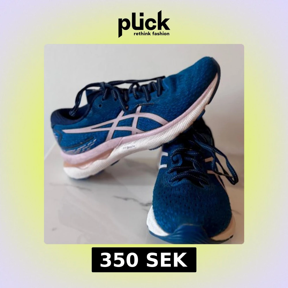 Snygga ASICS Gel-Nimbus 24 sneakers i blått med ljusrosa och vita detaljer. Ovandelen är i ventilerande syntetmaterial och har snörning. Sulan är dämpad och har bra grepp, perfekt för löpning eller träning. Ikonisk ASICS-logga på sidorna och bekväm passform. I gott skick - endast använda ett fåtal gånger. US 8, passar som en 38.5