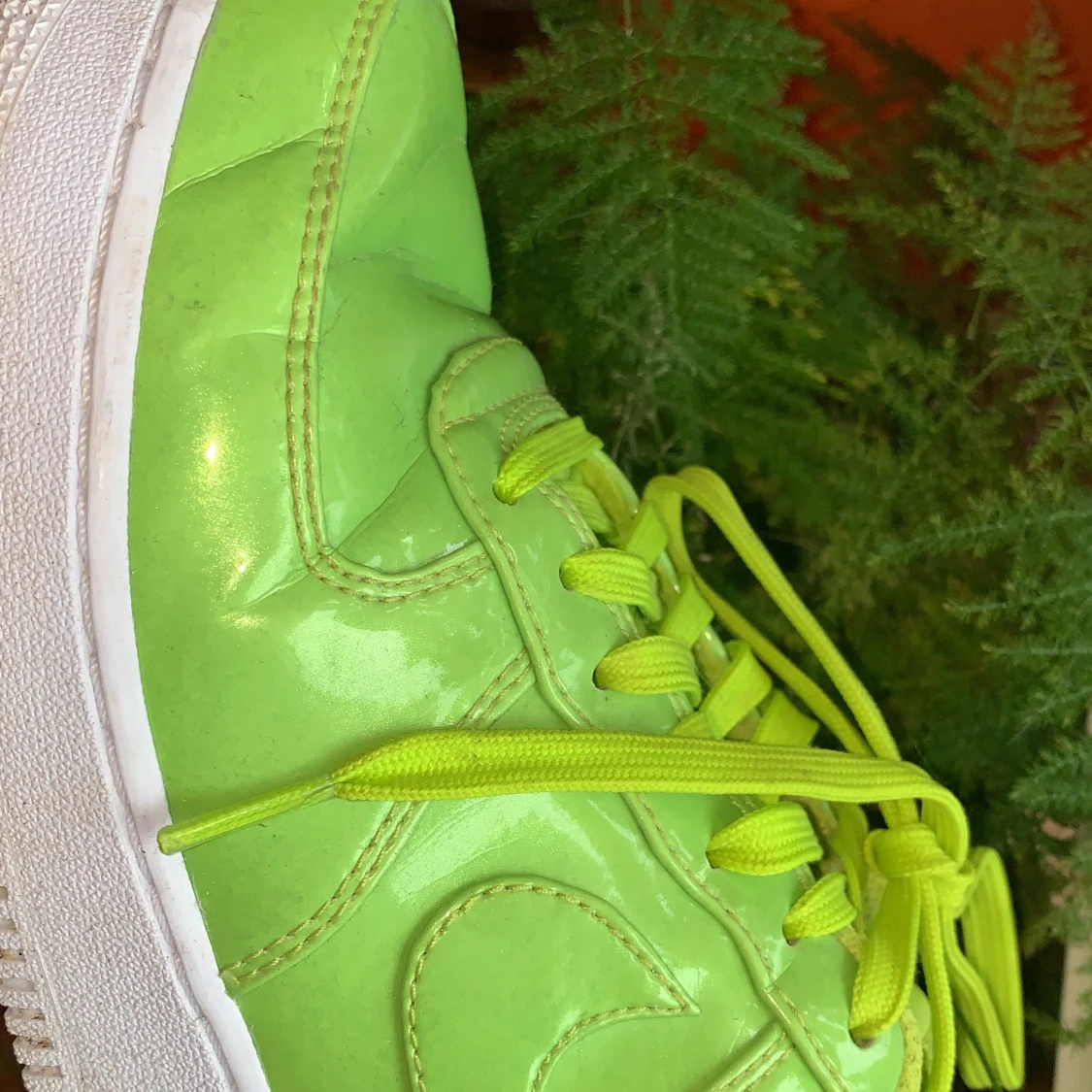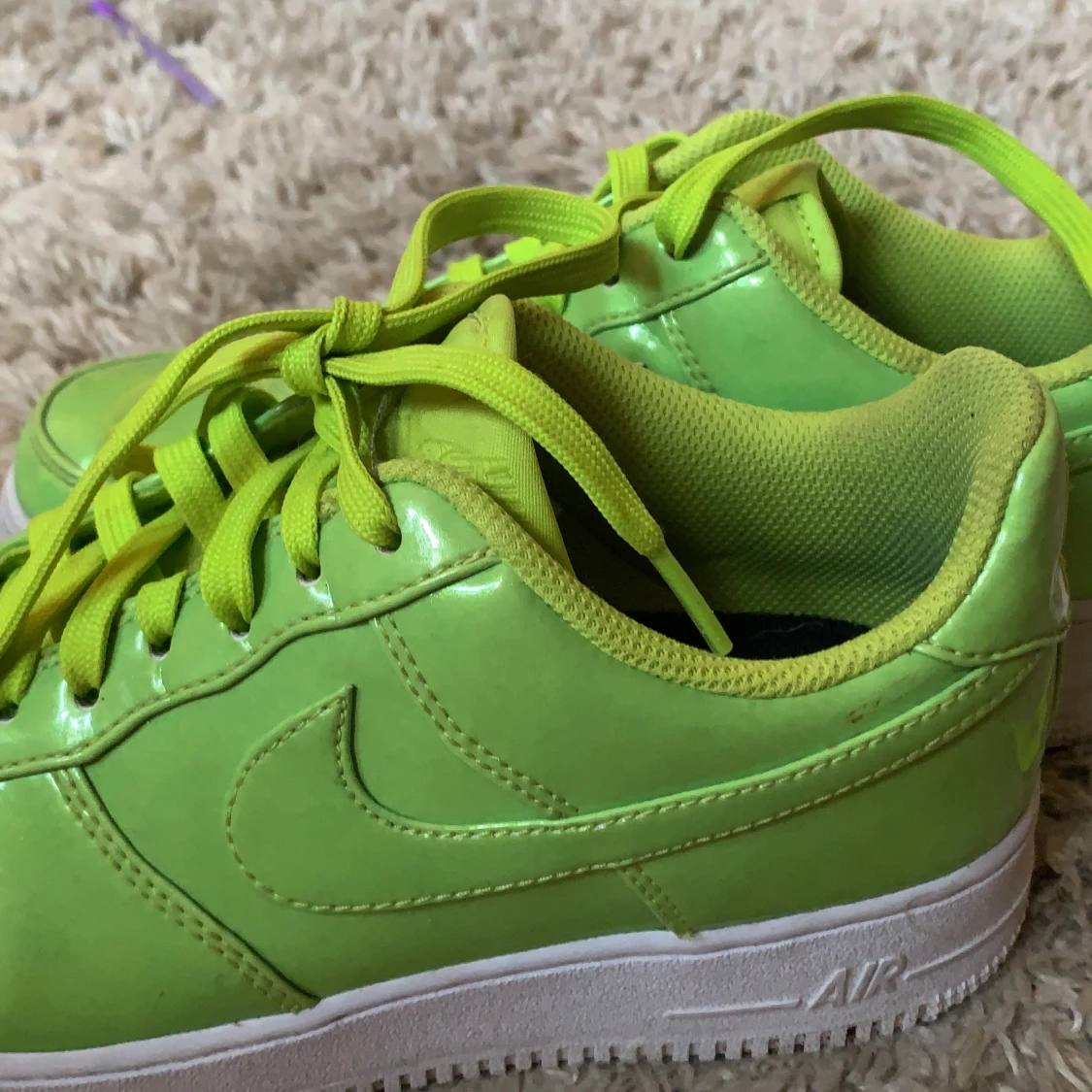 Supercoola af1 i neongrön färg, i glansigt material. Använda ( kolla bild 2 för defekt) annars i prima skick. 🐸🪲🦖🐍🐢🦚🐲🌿🌱
