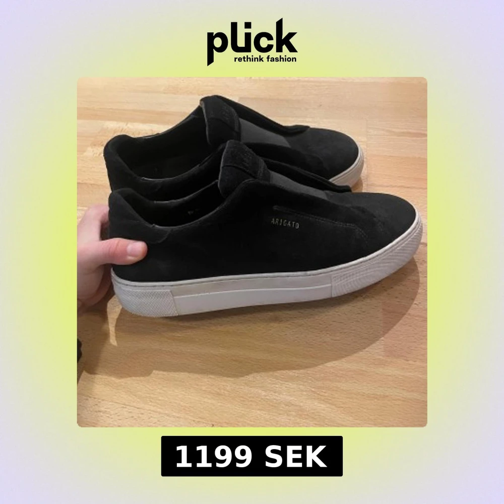 Stilrena svarta sneakers från Axel Arigato i mjuk mocka med vit platt sula. Skorna har minimalistisk design utan snörning och diskret guldfärgad logga på sidan. Perfekta för en clean och modern look. Skick är typ 7/10. Skicka gärna för fler bilder på mina skor.