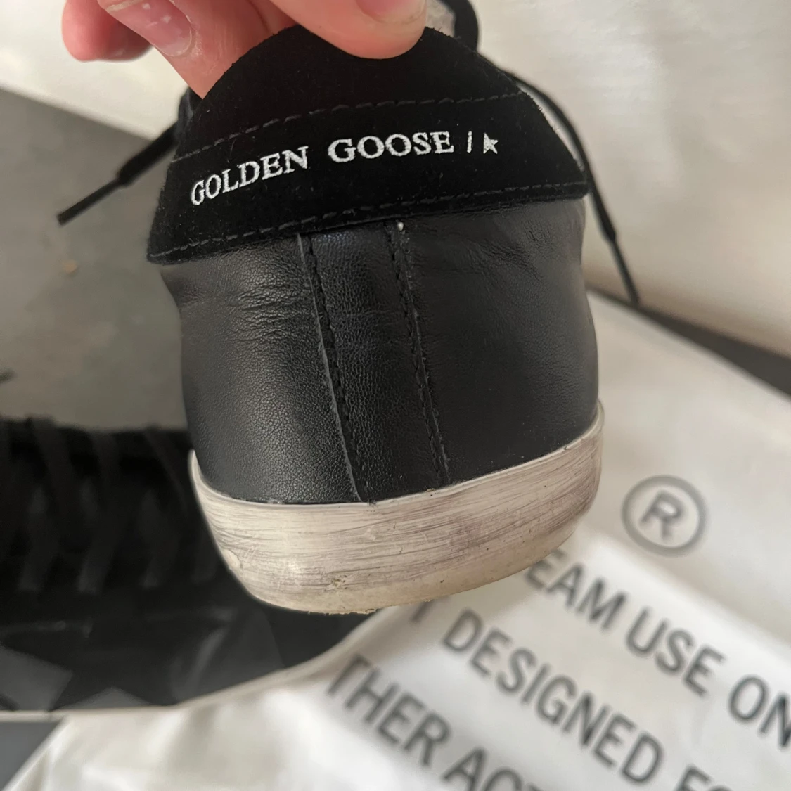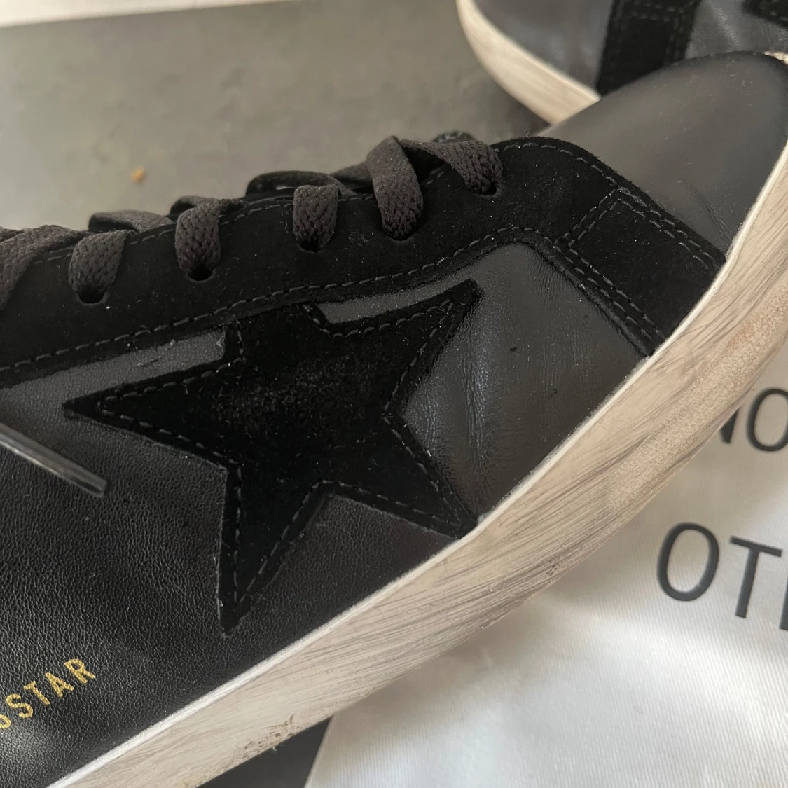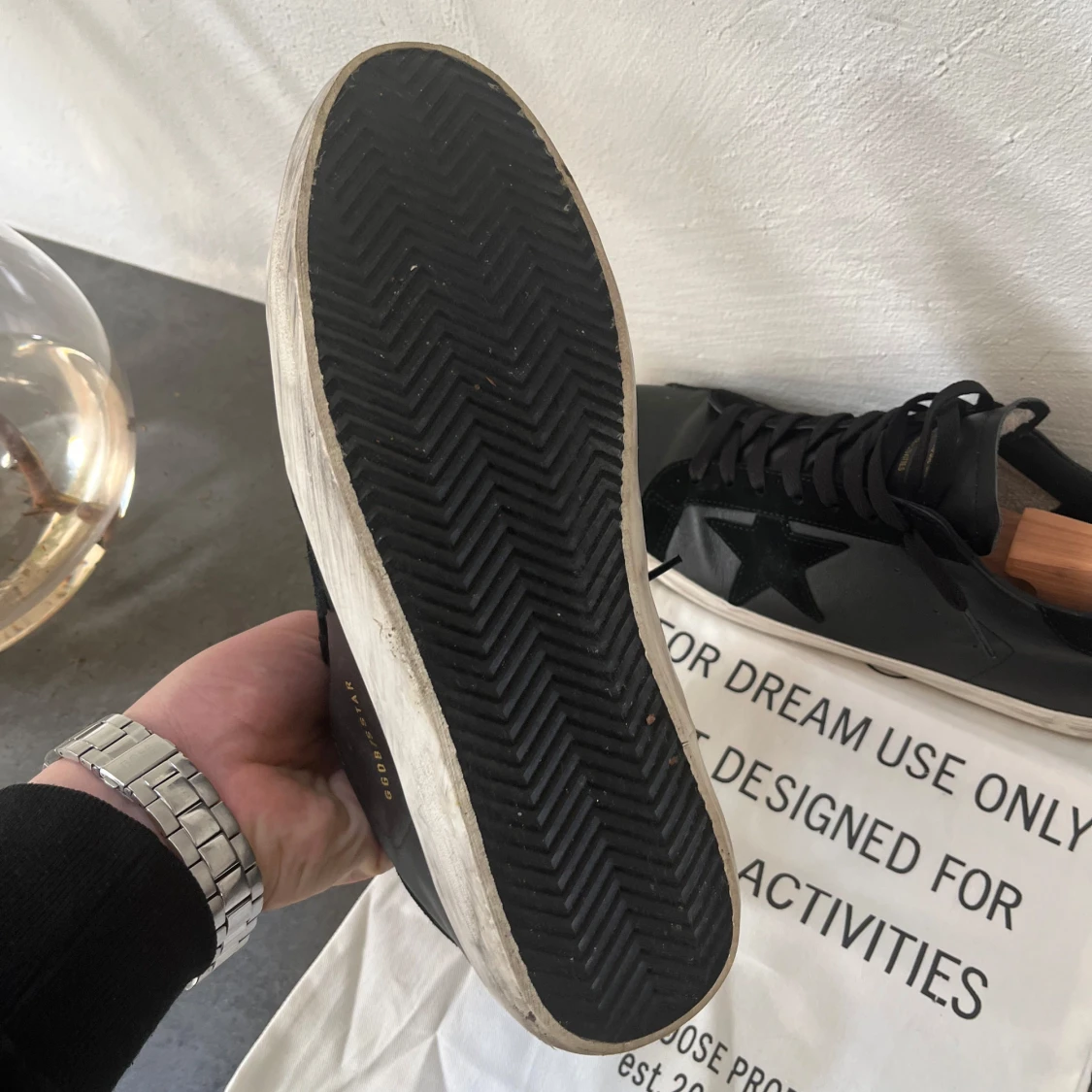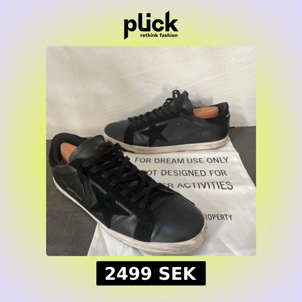 Säljer ett par svarta Golden Goose som är riktigt feta inför sommaren och kommande säsonger. Dem har en stil som gör att de ser slitna ut vilket gör att de blir unika. De är använda 2 gånger och är otroligt sköna och stilrena. Låda medföljer ej