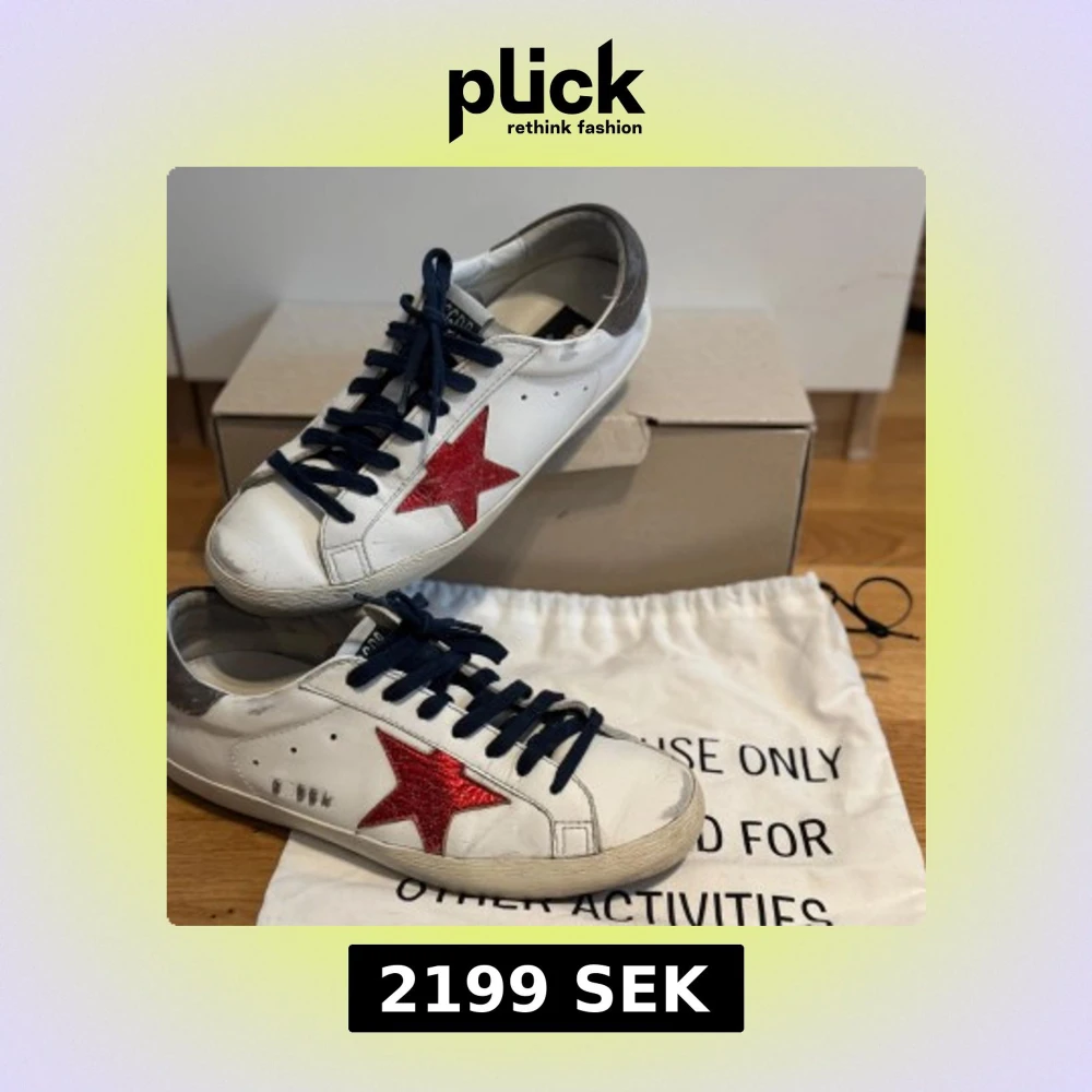 Säljer ett par vita Golden Goose sneakers med en glittrig röd stjärna på sidan, mörkblå snörning och grå hälkappa. Skorna är köpta i Grekland år 2023 från affärerna Soho-Soho. Box, klistermärken, påse och kvitto ingår!👊 Köpta för €460 vilket motsvarar 5000 Kr. Skick 9/10, inte använt så ofta. Frakt står köparen för.