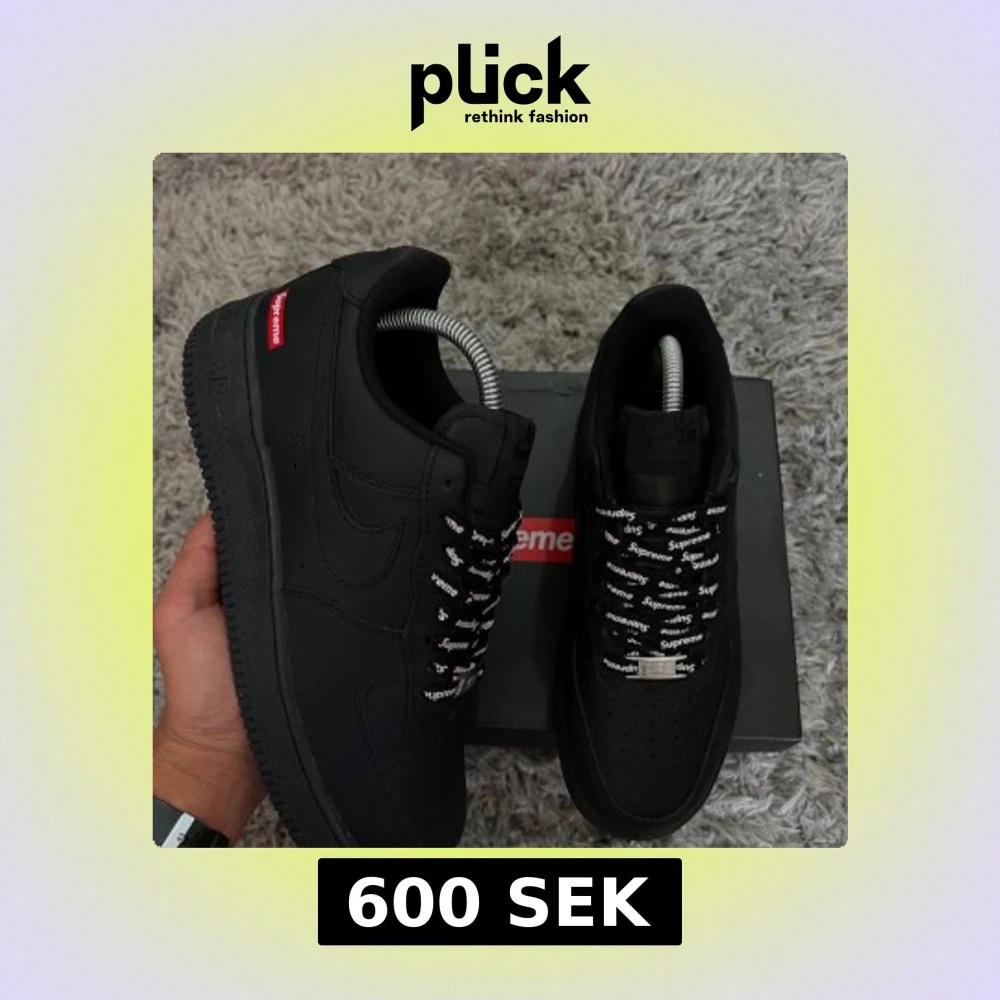 Klassisk low-top siluett i skinn med Supreme-logga på hälen och svarta skosnören med vit Supreme- och Nike-tryck. Platt sula och rund tå. Perfekta för dig som gillar streetwear och vill sticka ut.