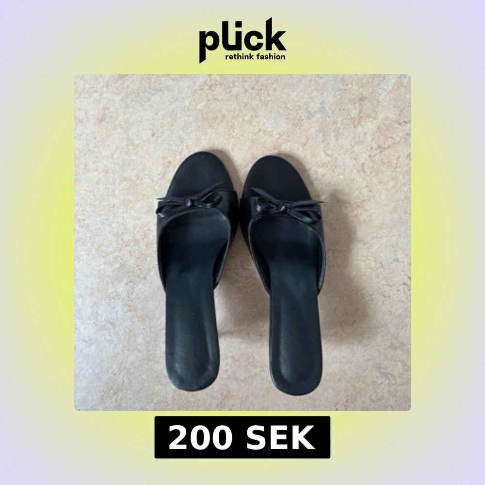 Stilrena svarta sandaler med låg klack och öppen tå. Skorna har en söt rosettdetalj framtill och är tillverkade i ett slätt material som ger en elegant look. Perfekta för dig som gillar en klassisk och chic vibe.
