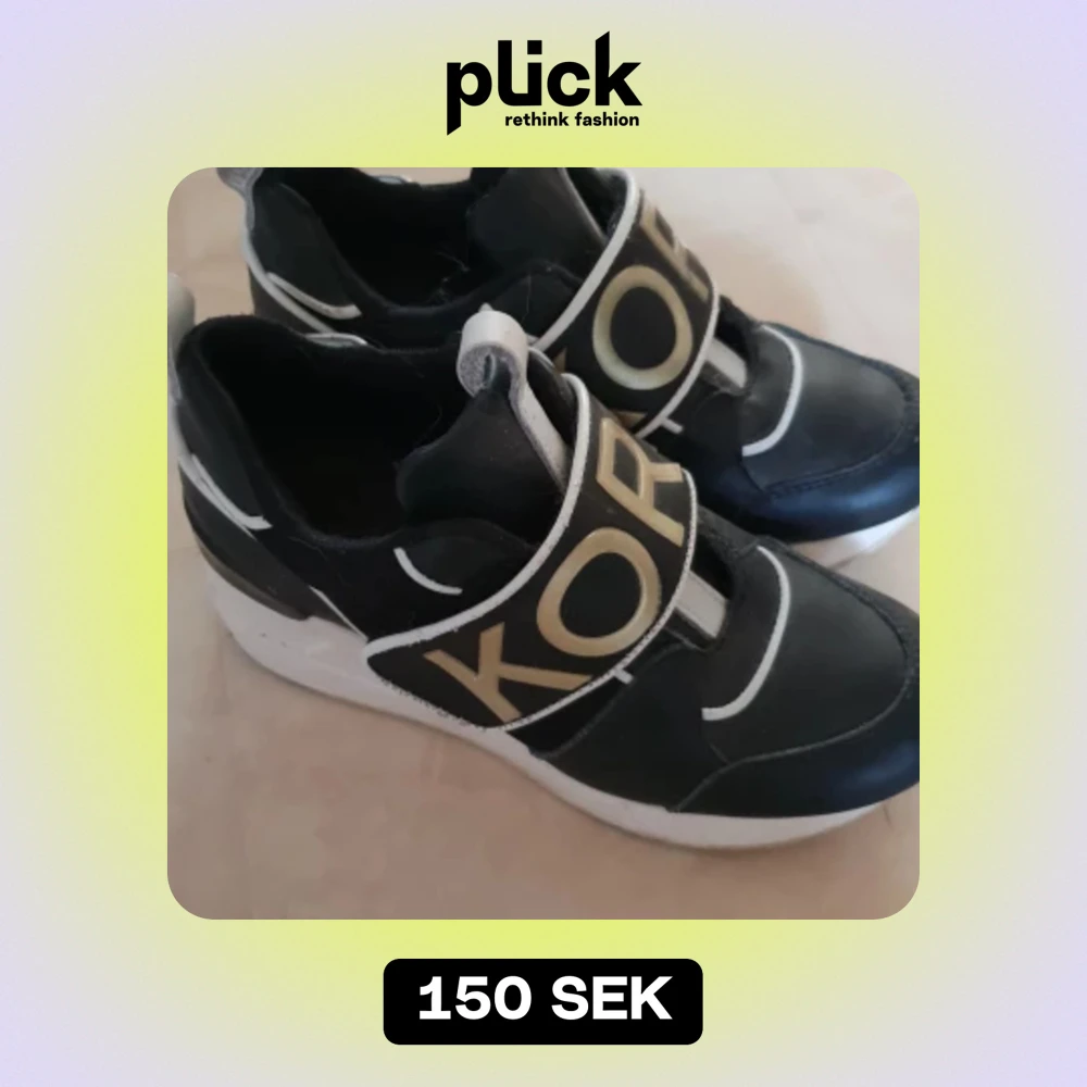 Snygga michel kors stolek 33 svarta sneakers med en vit sula och breda remmar över foten med en stor logga. De har en modern design med vita detaljer som ger en cool kontrast. Perfekta för en casual look eller när du vill sticka ut lite extra.
