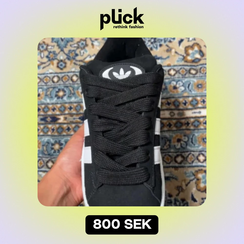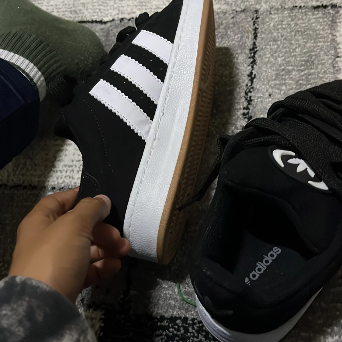 Säljer ett par svarta Adidas Campus sneakers i nyskick. Skorna har den klassiska tre-randiga designen i vitt och är gjorda i skinn. De kommer med extra vita skosnören. Perfekta för både vardag och fest!