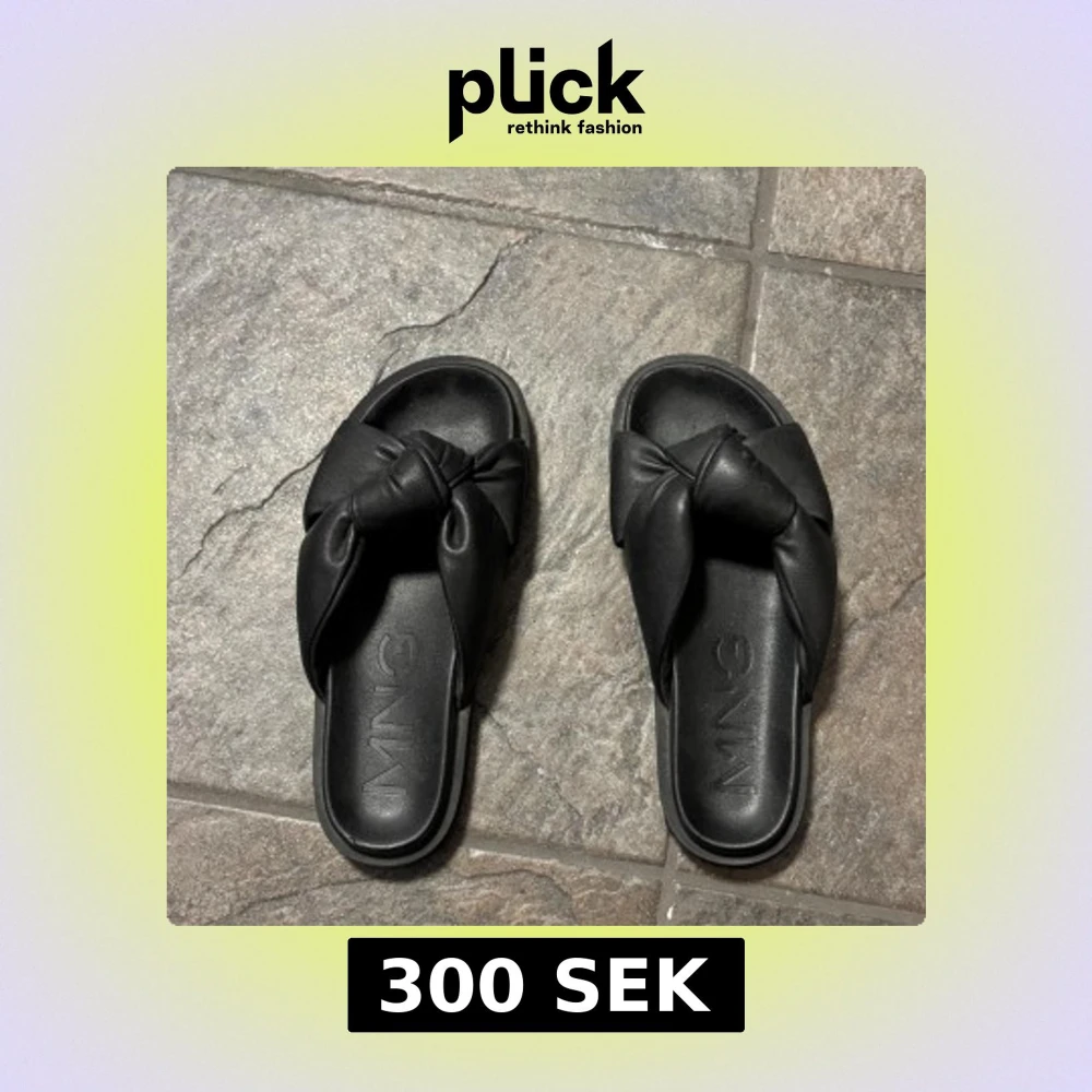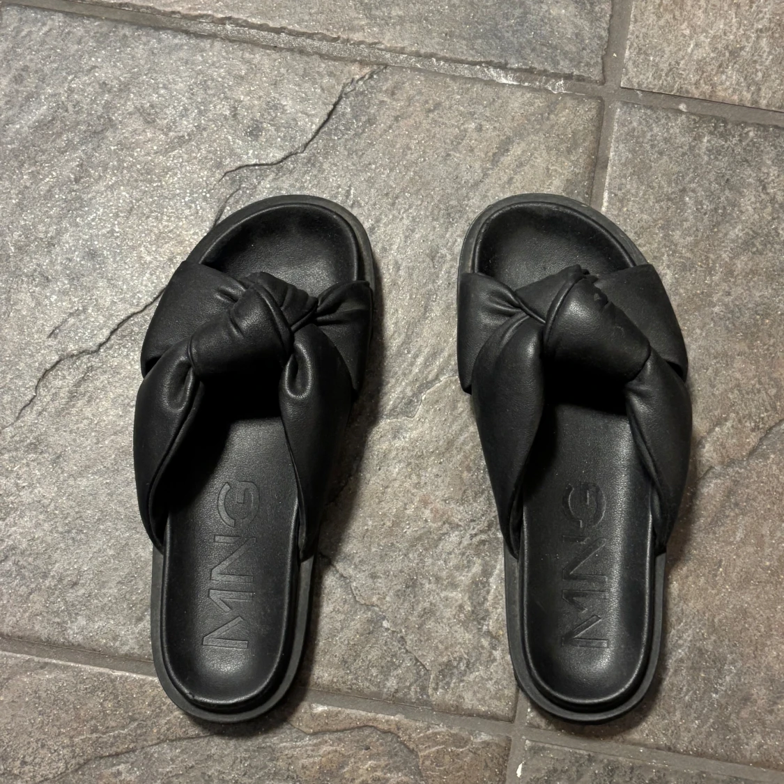 Stilrena svarta sandaler från mango med breda remmar i skinnimitation och snygg knutdetalj upptill. Platt sula och öppen tå gör dem perfekta för varma dagar. Enkla att matcha till olika outfits. Knappt använda.