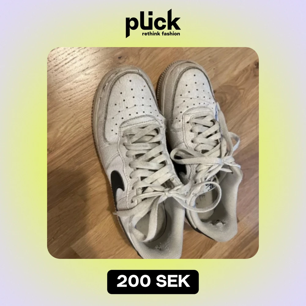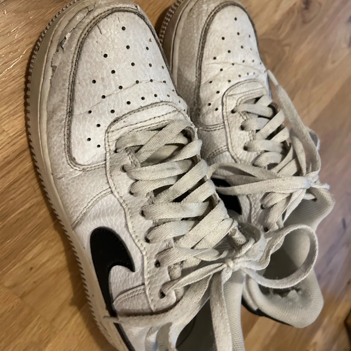 Säljer ett par vita Nike sneakers med svart swoosh. De är lite slitna men fortfarande snygga och bekväma. Perfekta för vardagsbruk.