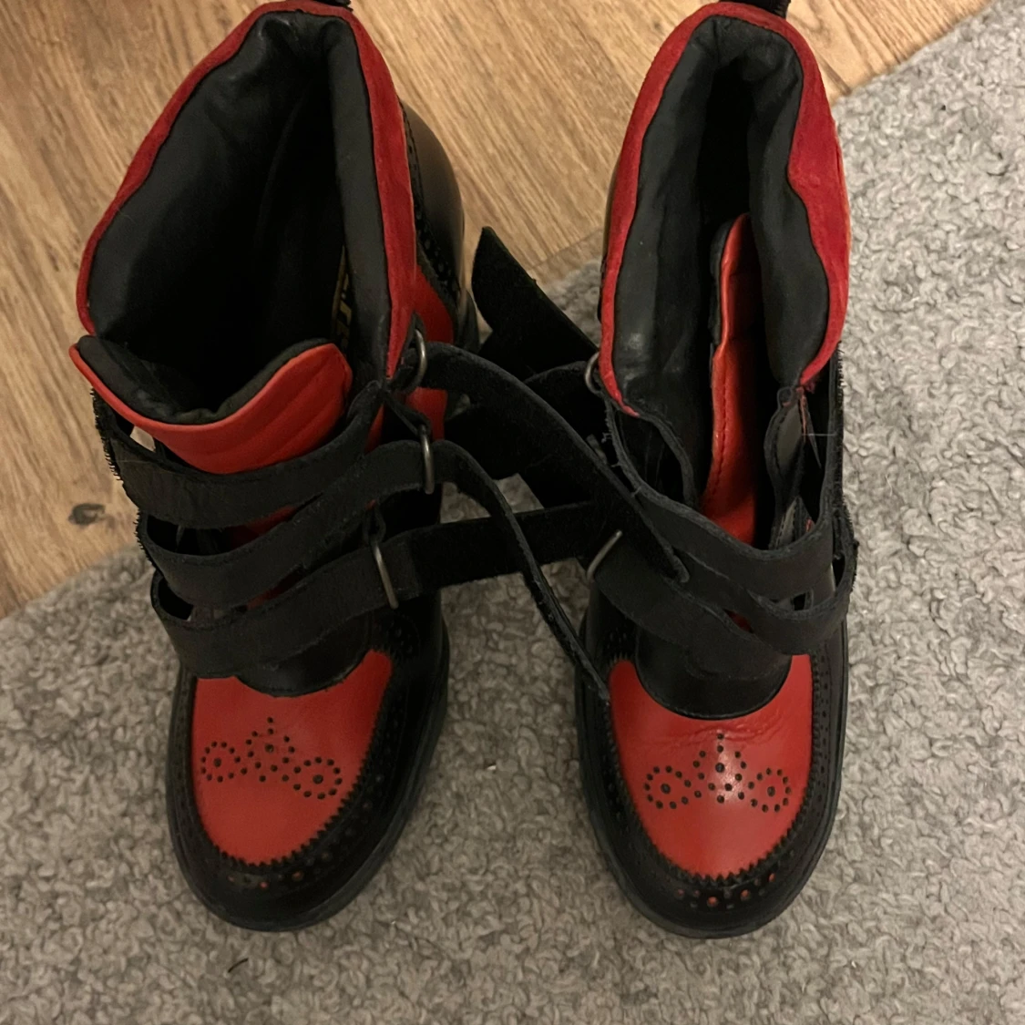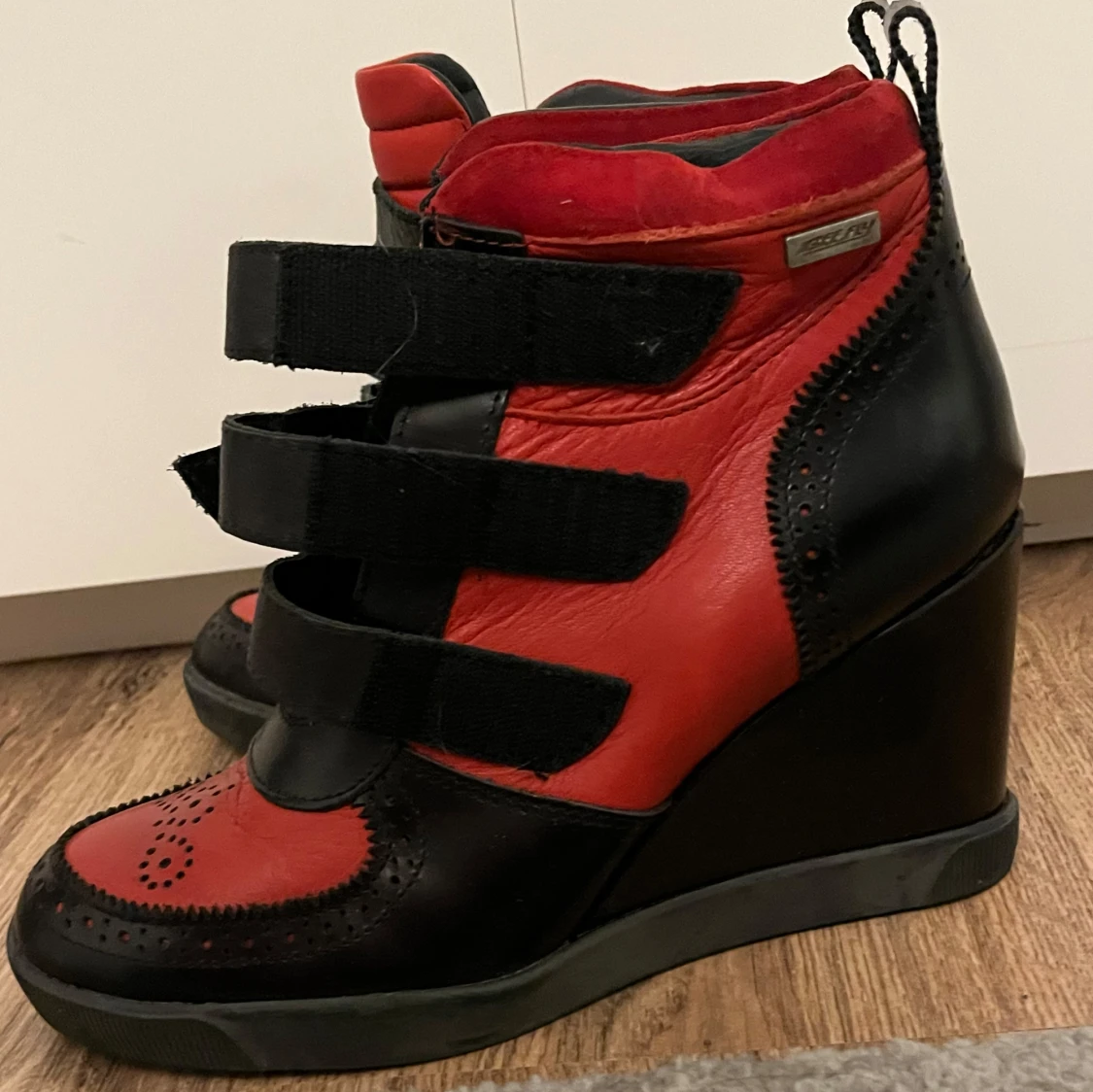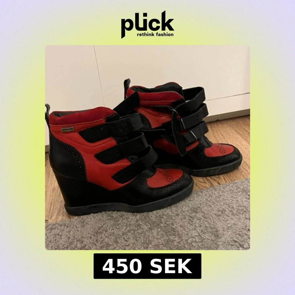 Snygga kilklacksskor i svart och rött med dekorativa detaljer och kardborreband. Liknar Isabel marant skor! Perfekta för att ge lite extra höjd och stil till din outfit.