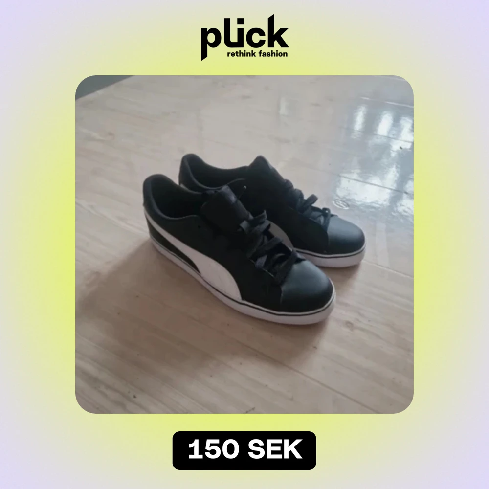 Säljer ett par snygga svarta sneakers från Puma. De har en klassisk design med vit sula och den ikoniska Puma-loggan i vitt på sidan. Skorna har snörning och är perfekta för vardagsbruk.