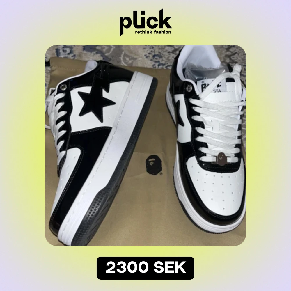 Svarta Bape skor kopior i storlek 43. Denna version är ”black white patent leather” samt är i 9/10 skick använda ett par gånger. Crease-skydd och dust bag ingår! Priset kan diskuteras vid snabbaffär!
