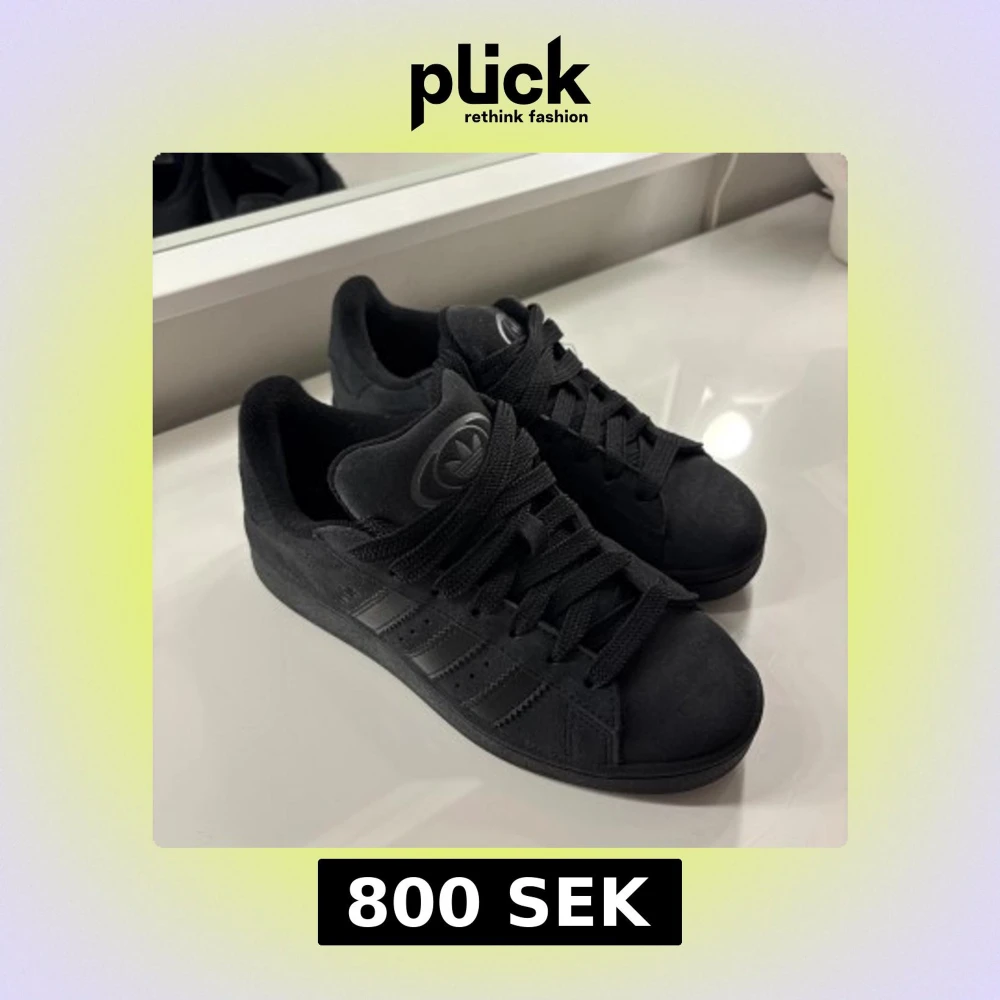 Säljer ett par helsvarta Adidas sneakers i mocka med klassiska tre ränder på sidan och Adidas-logga på plösen. Skorna har snörning och platt sula, helt nya.