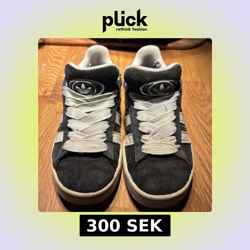 Säljer ett par klassiska svarta Adidas Campus sneakers med vita detaljer och snörning. Skorna har en stilren design med tre vita ränder på sidan och Adidas-logga på hälen. Perfekta för en avslappnad stil. Får även med ett par svarta snören