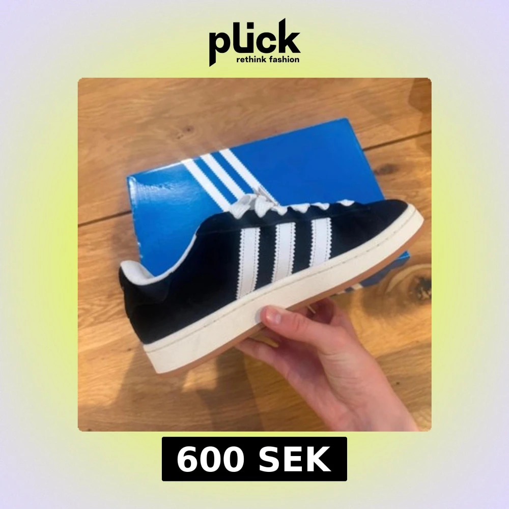 Klassiska Adidas Campus sneakers i svart mocka med vita ränder och vit sula. Skon har snörning och en gummisula med bra grepp. Perfekt för dig som gillar en stilren och tidlös look.