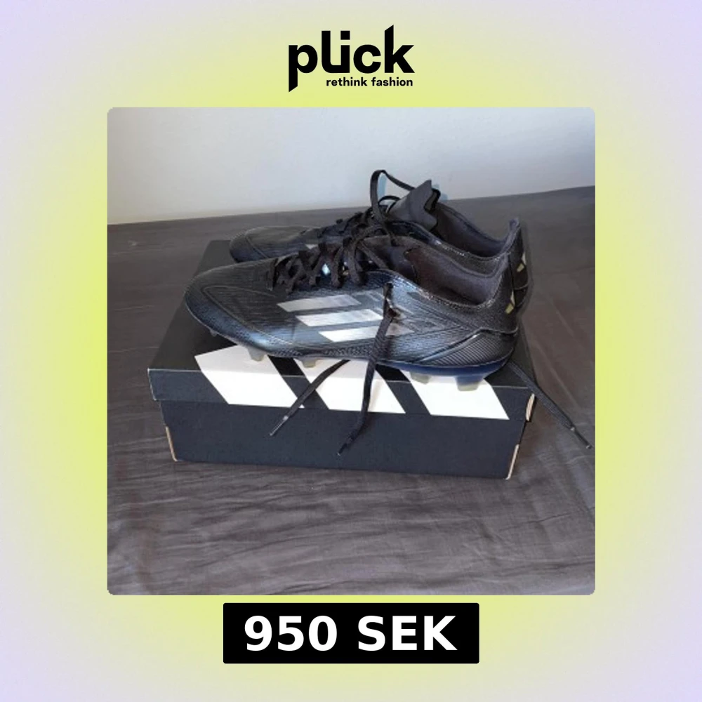 Snygga svarta adidas fotbollsskor med klassiska tre ränder i silver på sidan. Skorna har snörning och platt sula med fasta dobbar för bra grepp på planen. Tillverkade i syntetmaterial och designade för att vara lätta och snabba på fotbollsplanen. Det är inte några elite skor det är pro. Skorna är oanvända, har endast tagit på mig dem för att kolla ifall dem passade eller inte. Dem var för stora för mig. Går också med på att göra byten på fotbollsskor och kan diskutera priset.