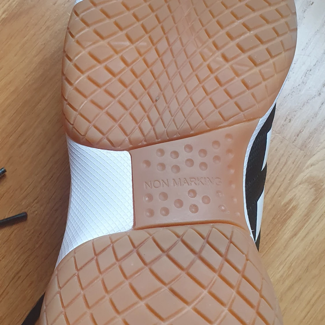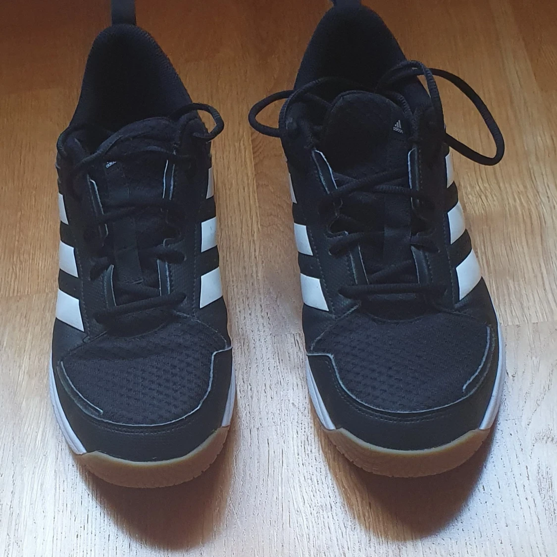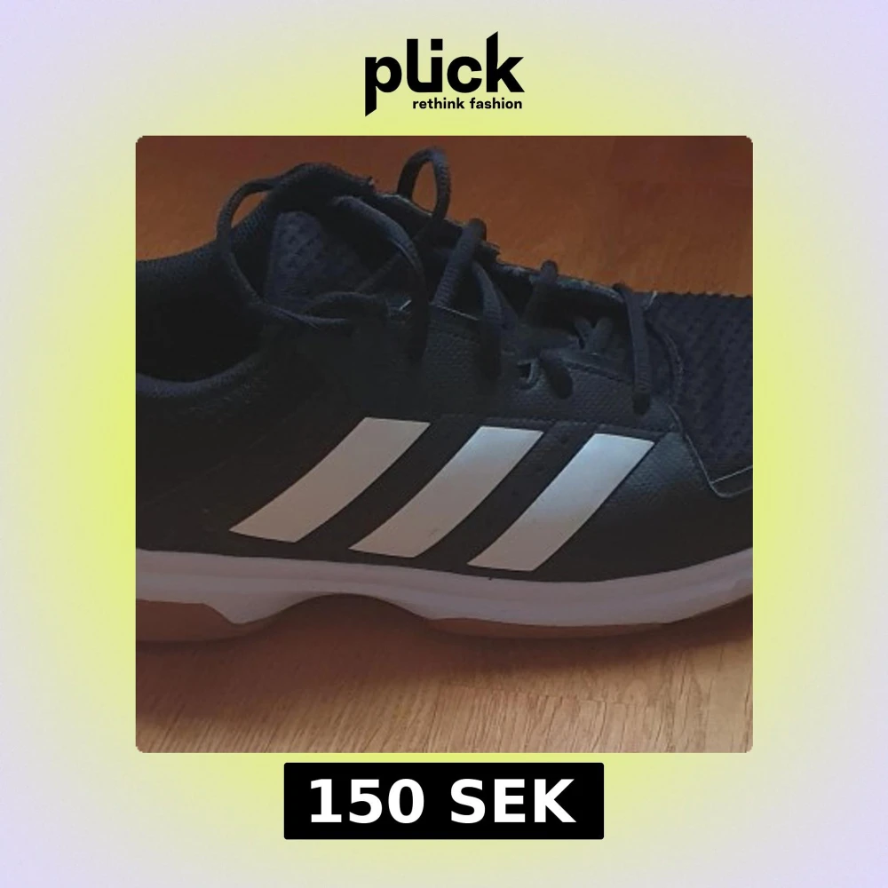Säljer ett par svarta Adidas innomhus-idrottsskor Skorna har snörning, mesh- och syntetmaterial samt gummisula med non-marking-funktion. Sparsamt använda. Storlek 44.