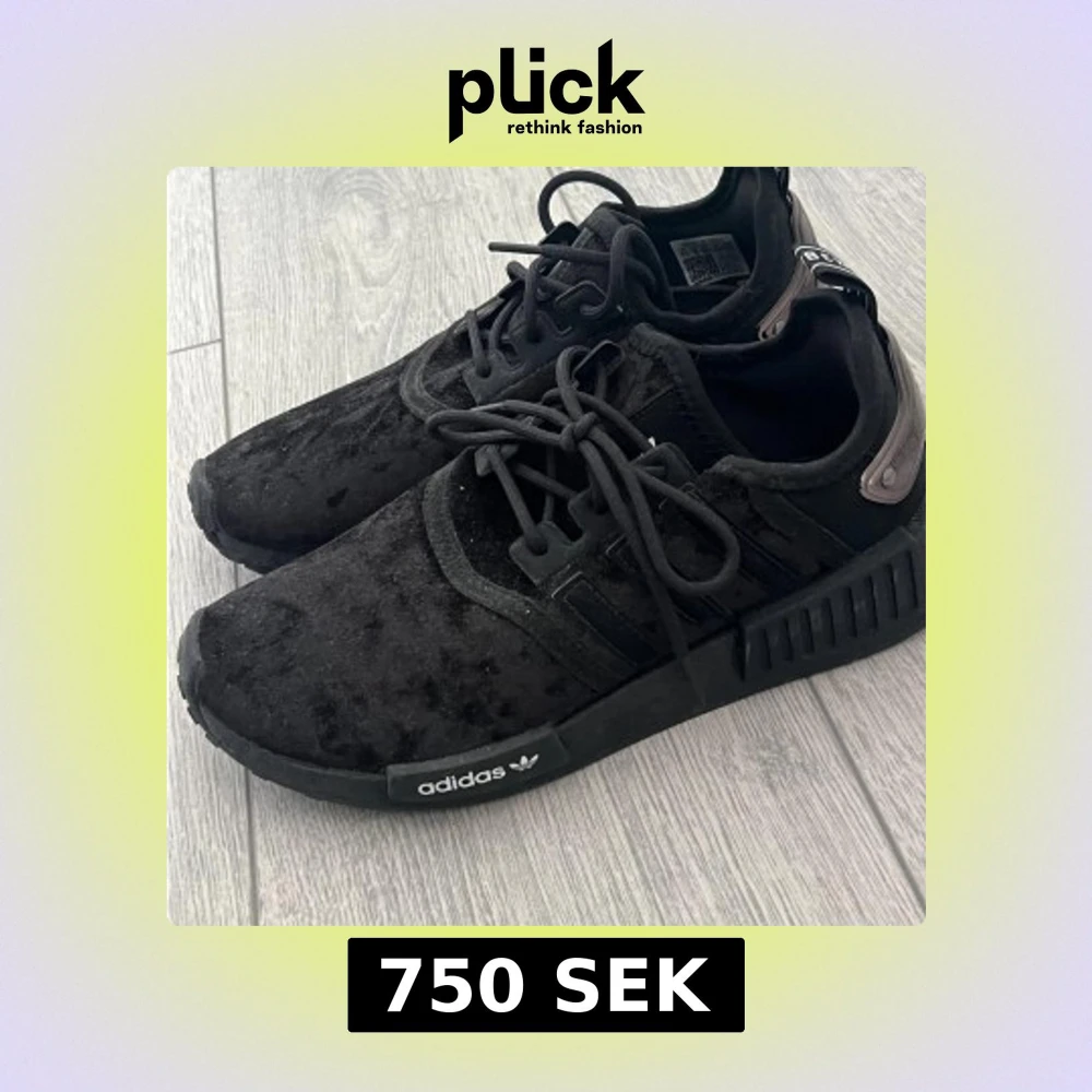 Säljer ett par svarta Adidas NMD sneakers med ovandel i mjuk mocka och detaljer i blank plast på hälen. Skorna har snörning och klassiska tre ränder på sidan. Snygg och stilren look som passar till det mesta. Adidaslogga på sidan och bak.