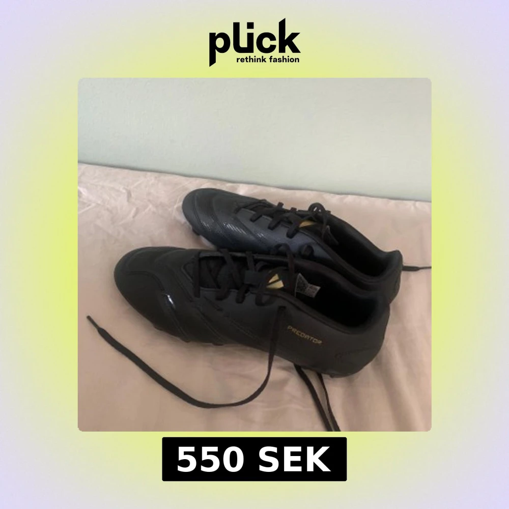 Säljer ett par svarta Adidas Predator fotbollsskor med snörning och dobbar för spel på gräs men funkar också väldigt bra på konstgräs. Skorna har en stilren design med diskreta detaljer och texten 'Predator' i guld på sidan. Perfekta för dig som vill ha bra grepp och kontroll på planen. De är i materialet läder.
