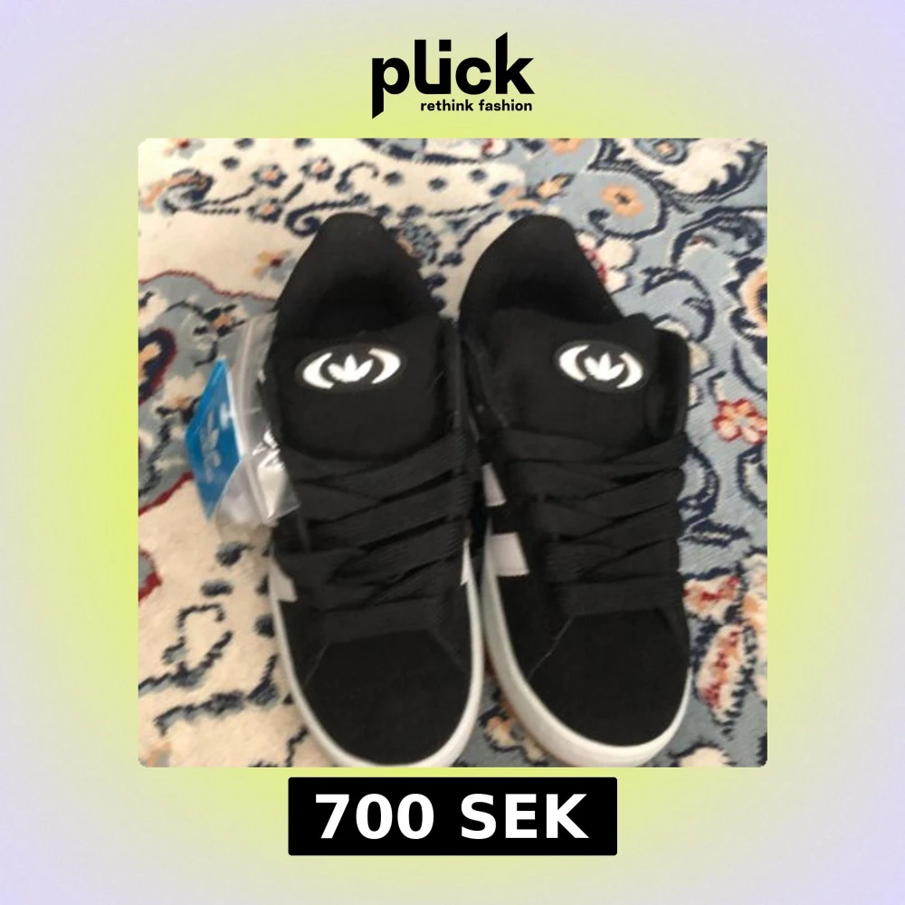 Säljer ett par klassiska svarta Adidas sneakers med vita ränder på sidorna och vit sula. Skorna har svart snörning och gummisula i brunt. Perfekta för en sportig och stilren look. Extra vita skosnören medföljer.