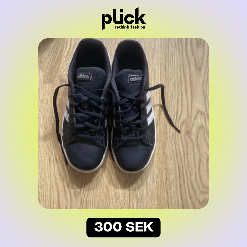 Säljer ett par svarta Adidas sneakers med de klassiska vita ränderna på sidorna. Skorna har snörning och en vit sula som är lite smutsig men annars i bra skick. Perfekta för vardagsbruk och passar till det mesta i garderoben.pris kan som vanligt diskuteras💗