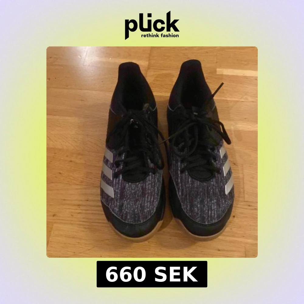 Snygga svarta inomhus skor från adidas lite använda men som gott som nya. Skorna har en tjock sula som dämpar väldigt bra när man hoppar och ska landa bra och stadigt. Tjocka sidor av skorna så att man sällan får ont när man springer i skorna och gör olika aktiviteter.