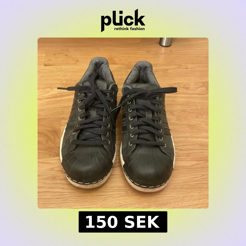 Säljer ett par svarta Adidas sneakers med klassiska tre ränder på sidan och vit sula. Skorna har snörning och rund tå, samt diskret Adidas-logga där fram.