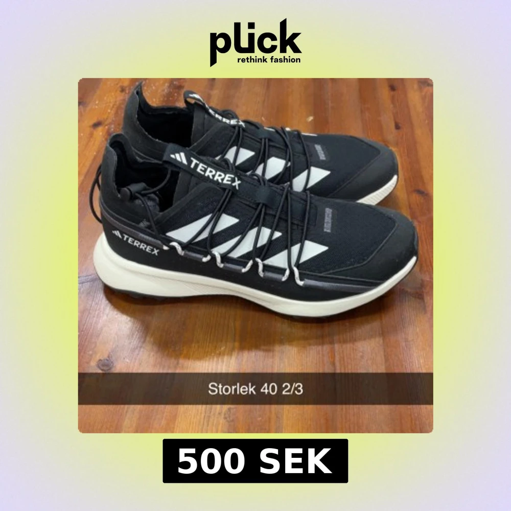 Säljer ett par svarta Adidas Terrex sneakers med vita detaljer och cool snörning. Skorna har en sportig design med robust sula och mesh-överdel, perfekta för dig som gillar outdoor och streetstyle.