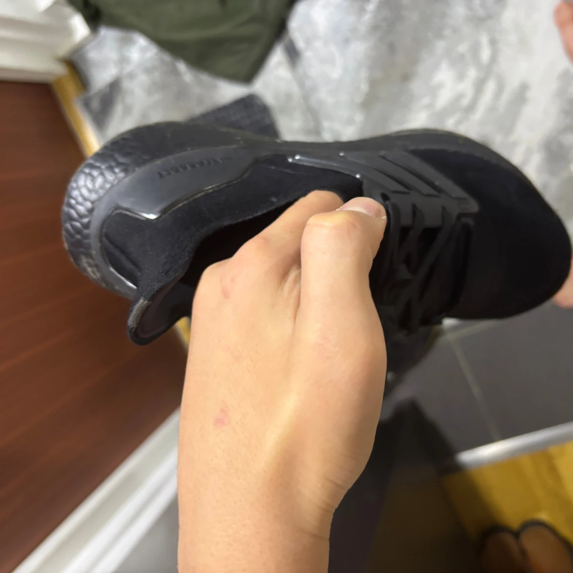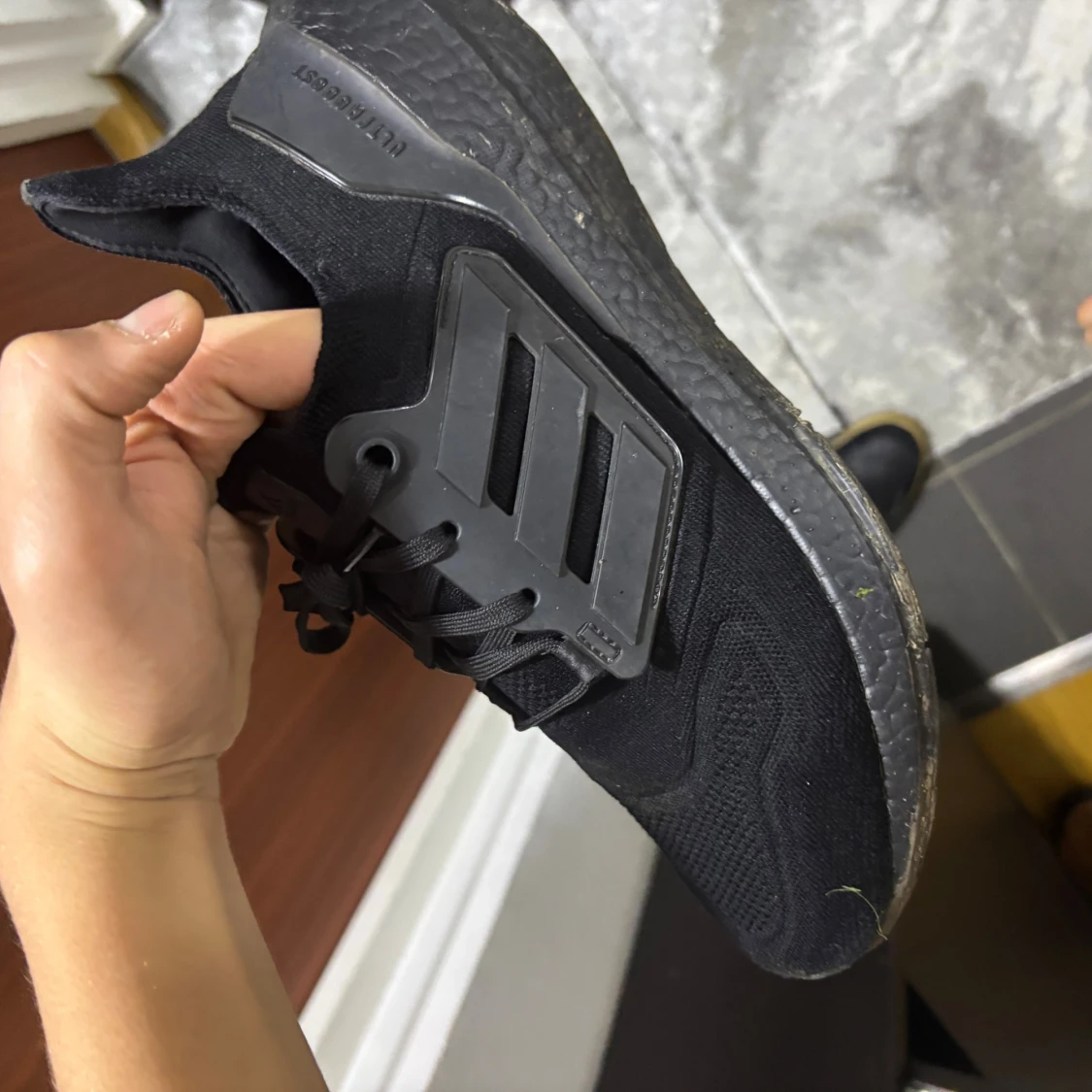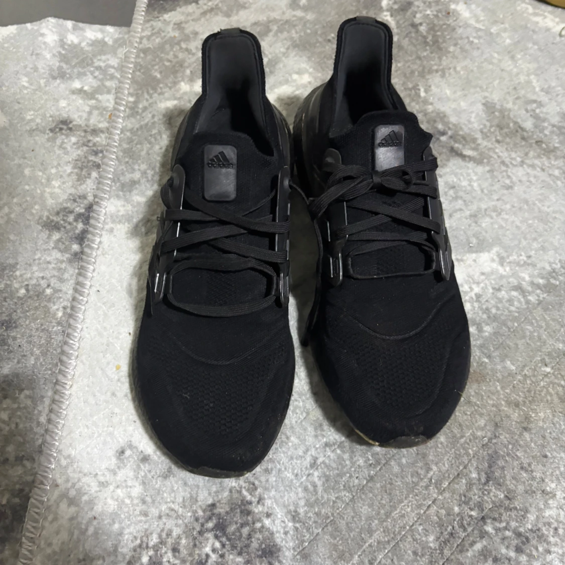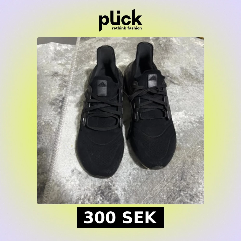 Säljer ett par helsvarta Adidas Ultraboost sneakers med klassiska tre ränder på sidan och snörning. Ovandelen är i mesh och syntet, och sulan är i mjukt, stötdämpande material för extra komfort. Perfekta för dig som gillar stilrena och sportiga skor.