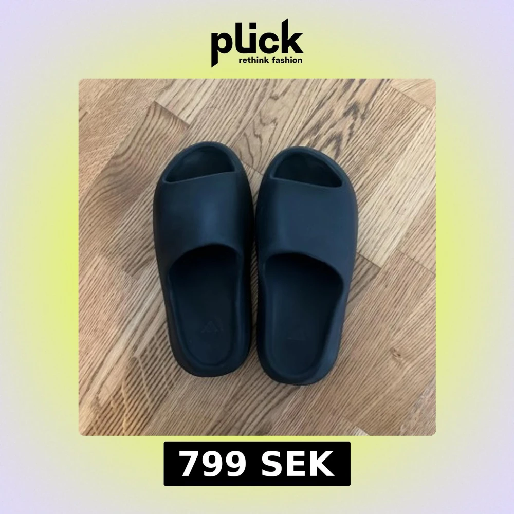 Säljer ett par svarta Adidas Yeezy Slides med chunky, räfflad sula och minimalistisk design. Tillverkade i syntetmaterial för en mjuk och bekväm känsla. Perfekta för chill dagar och enkel att glida i med öppen tå och stilren look.
