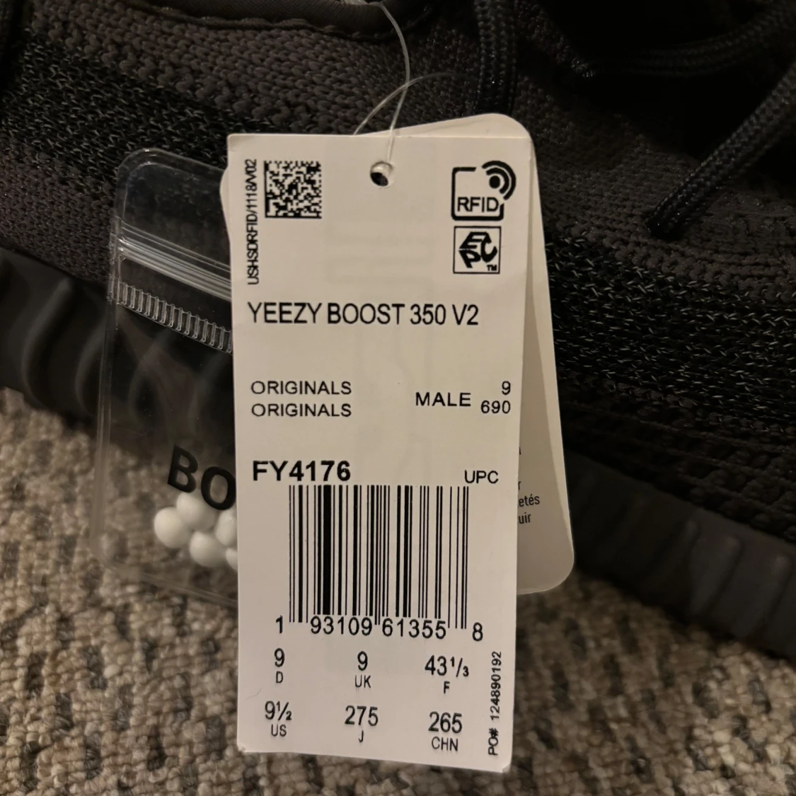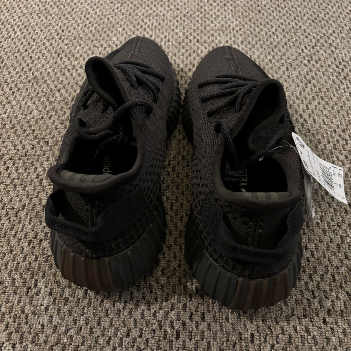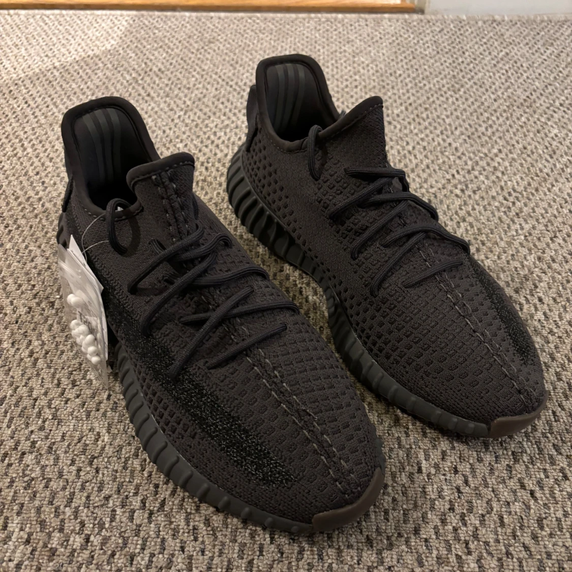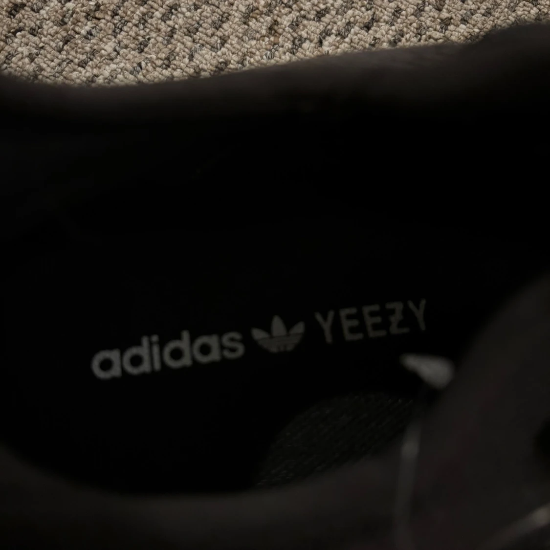 Säljer ett par svarta Adidas Yeezy sneakers med en stilren design. Skorna har en stickad ovandel och en bekväm sula med Boost-teknologi. Perfekta för dig som vill ha både stil och komfort.