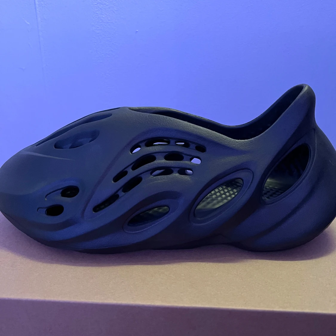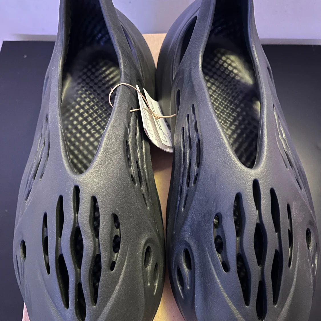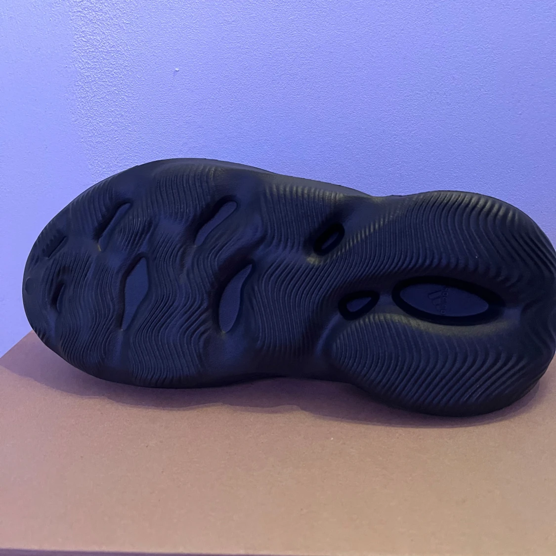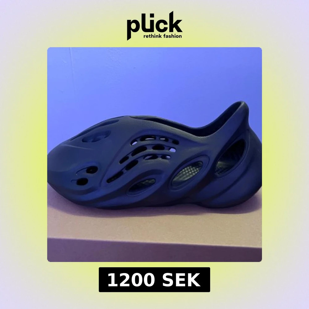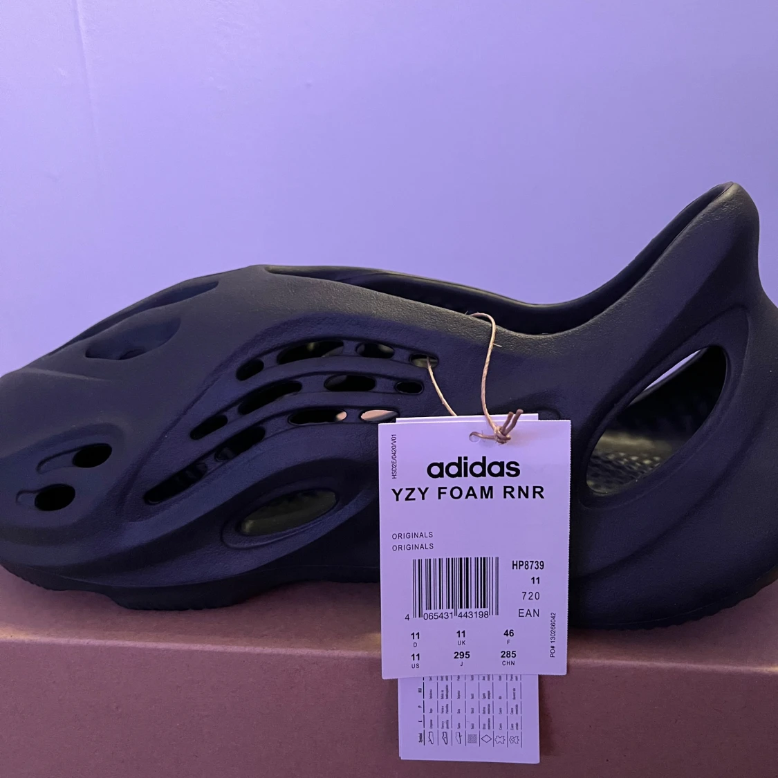 Säljer ett par svarta Adidas YZY Foam RNR med unik design och ventilerande hål. Perfekta för en modern och bekväm stil. Skorna är lätta och flexibla, vilket gör dem idealiska för vardagsbruk.