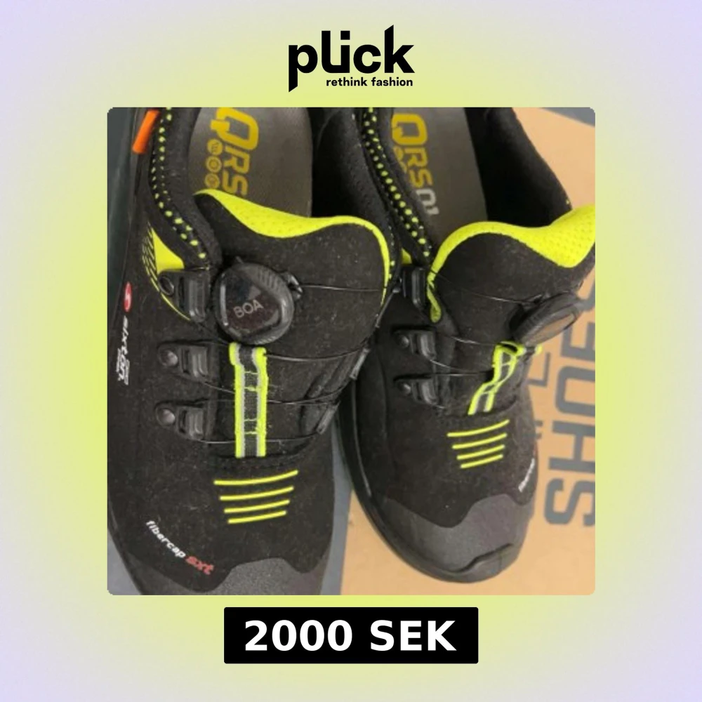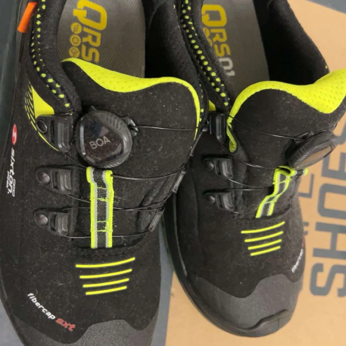Svarta arbetsskor från Arbesko med BOA-snörning och gula detaljer. Skorna har rund tå, platt sula och förstärkt tåparti. Perfekta för dig som vill ha både komfort och stil på jobbet.