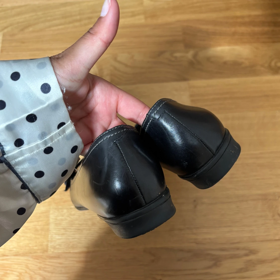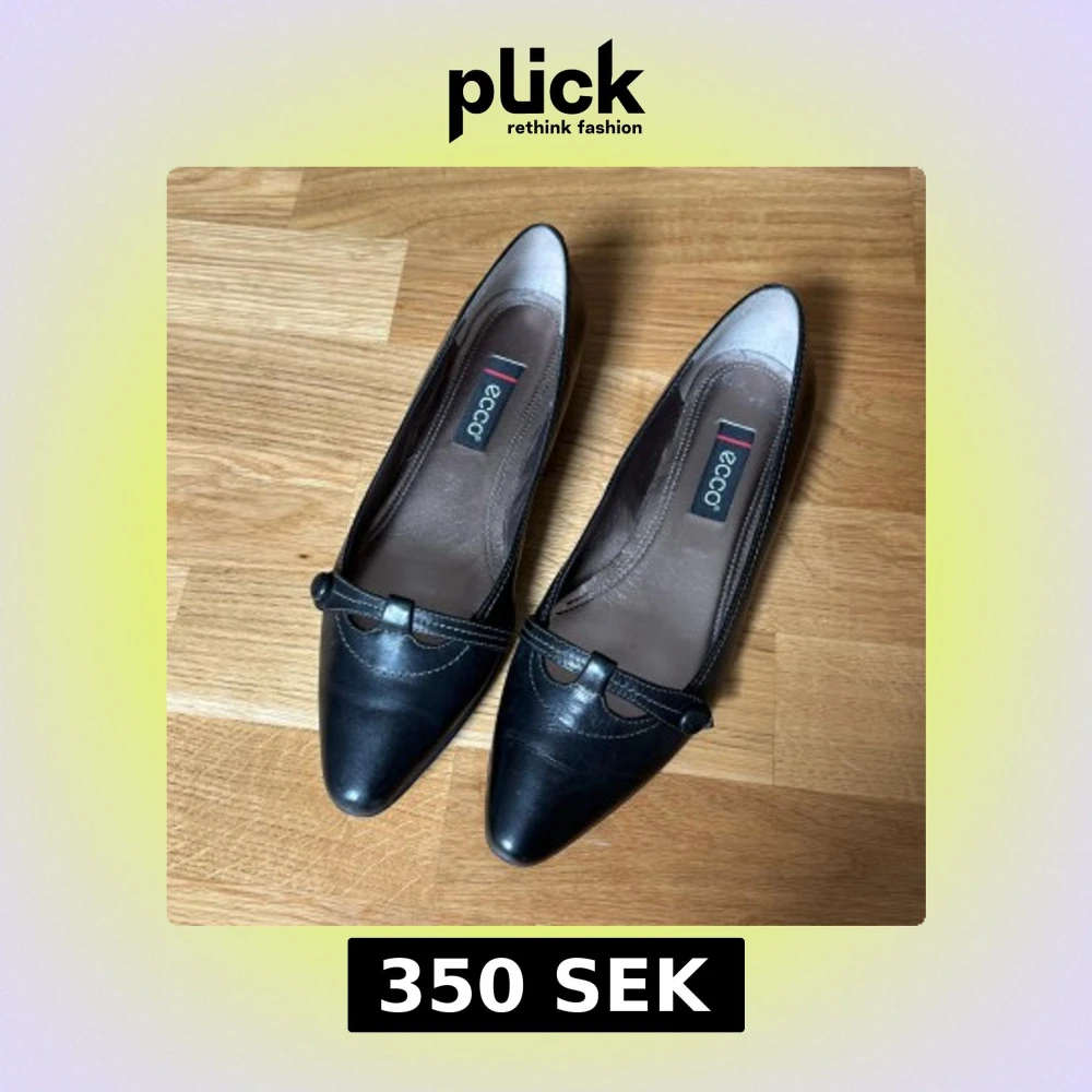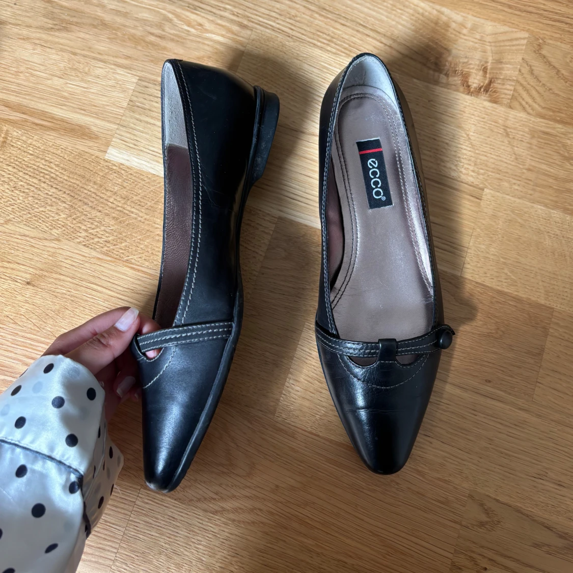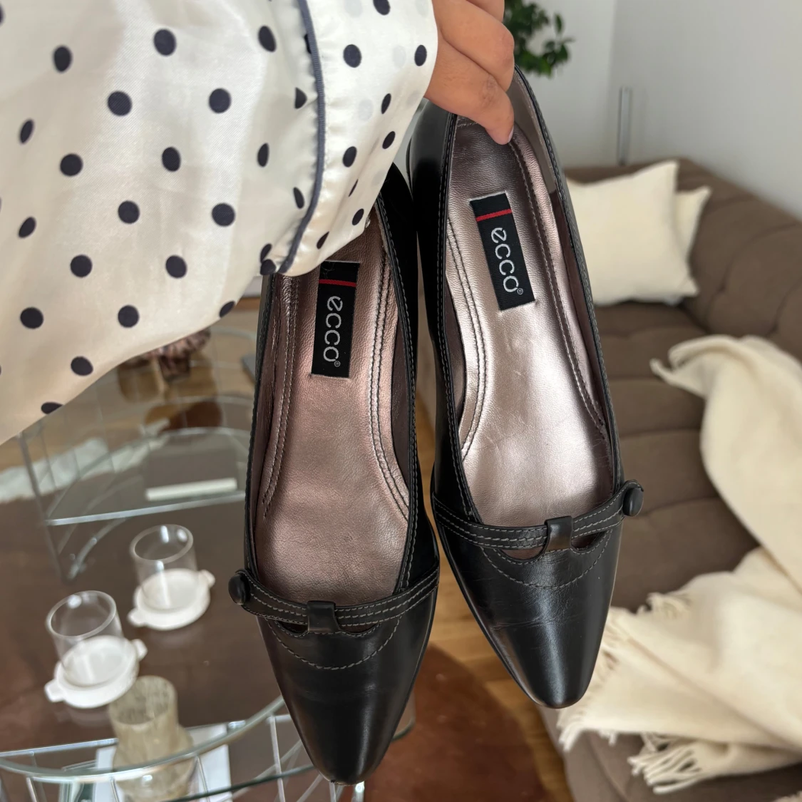 Vintage stil, klassiska svarta ballerinaskor från Ecco i skinn med spetsig tå och låg klack. Snygg detalj med rem och knapp framtill samt kontrastsömmar.