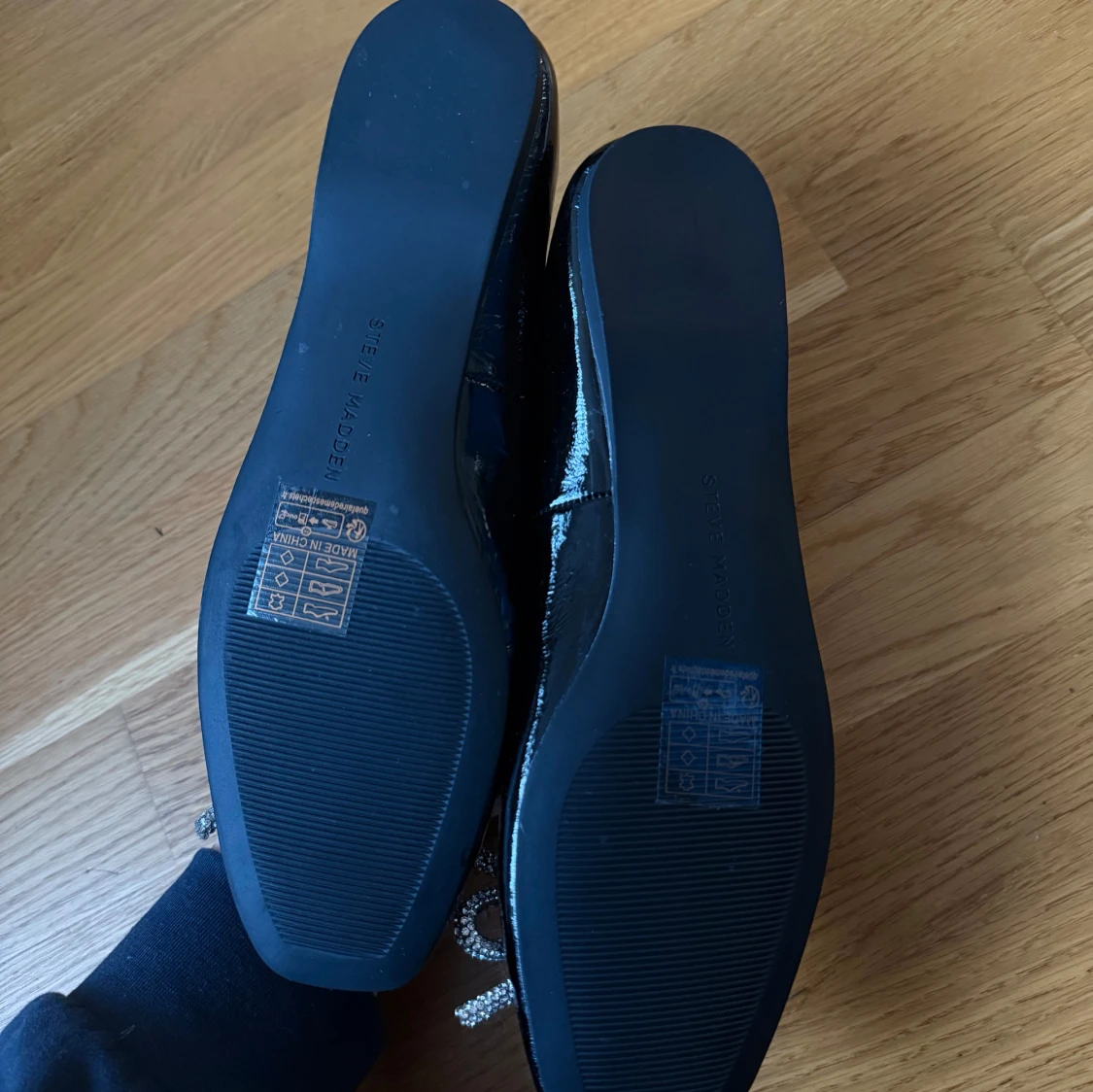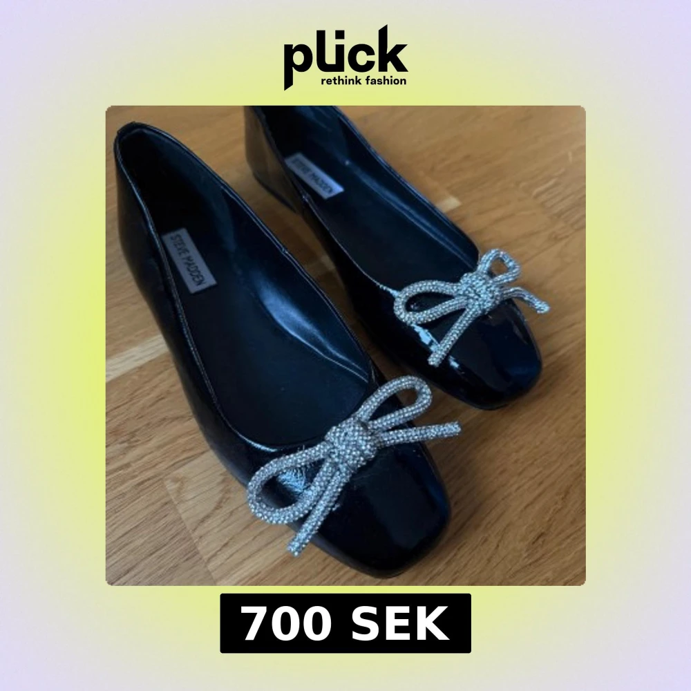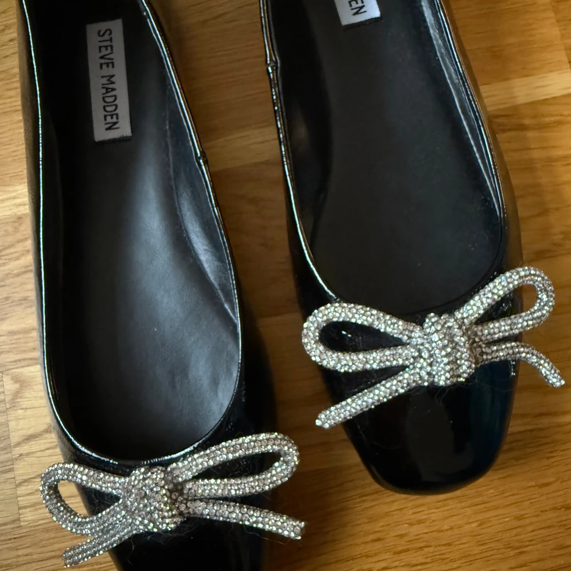 Svarta ballerinaskor från Steve Madden i glansigt material med fyrkantig tå. Dekorerade med en stor glittrig rosett framtill som ger extra bling. Platt sula och klassisk ballerinaform, perfekta för att lyfta vilken outfit som helst. Helt nya och oanvända. Storlek 40. Nypris 1319kr.
