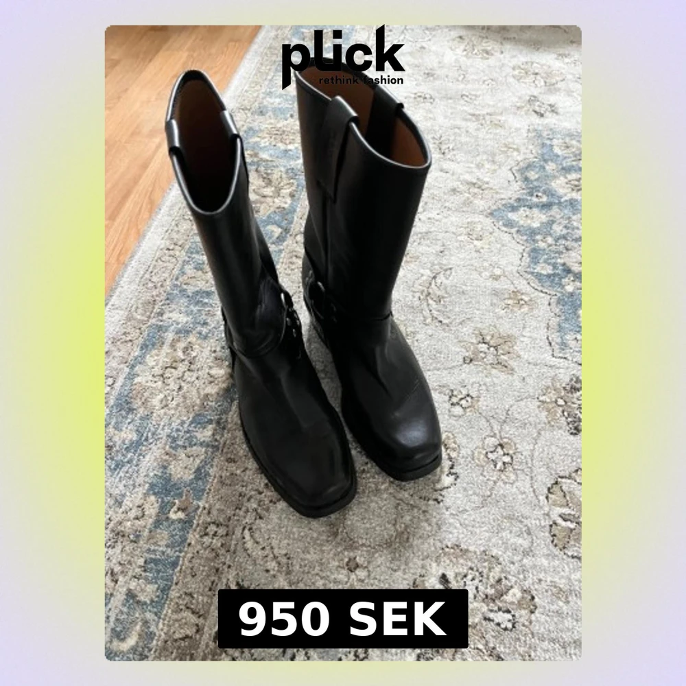 Säljer ett par svarta biker boots från MICC Westerni äkta skinn. Boots med rund tå, grov sula och låg klack. Dekorativa metallringar och nitar vid ankeln ger en cool look. Klassisk modell med högt skaft och dragflikar upptill. Perfekta för dig som gillar edgy stil.