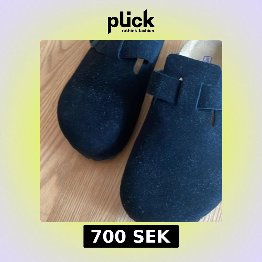 Svarta Birkenstock Boston sandaler i mjuk mocka med rund tå och justerbart spänne. Klassisk slip-in modell med ergonomisk fotbädd i beige och platt sula. Perfekt för chill dagar och enkel att matcha med olika outfits.