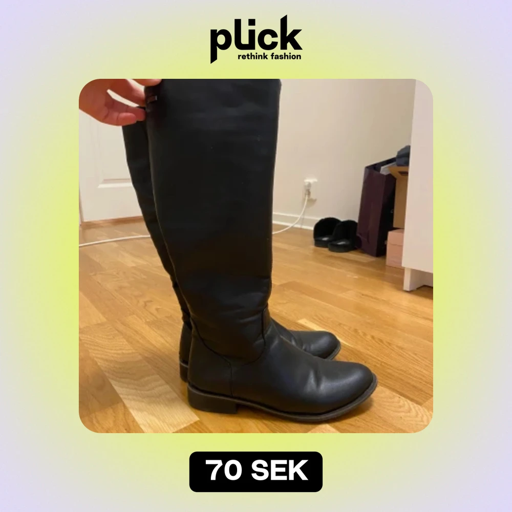 Svarta snygga boots med lite lägre klack. Använda ett par gånger och är super sköna, det är bara ena ”knappen” som man stänger med är av, men fungerar lika bra med ett gem eller något annat litet. 😊