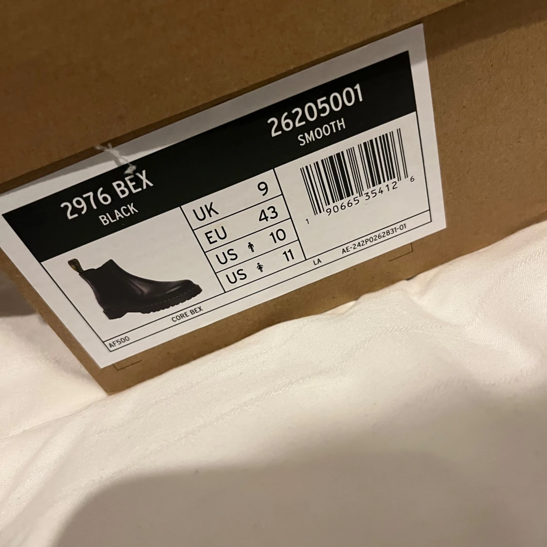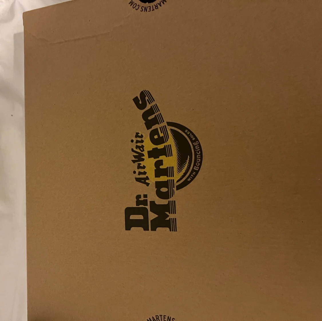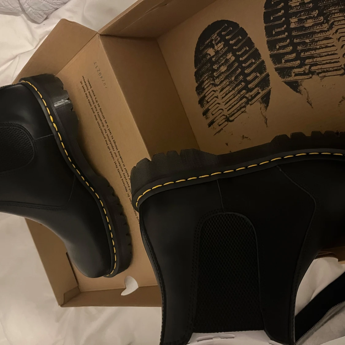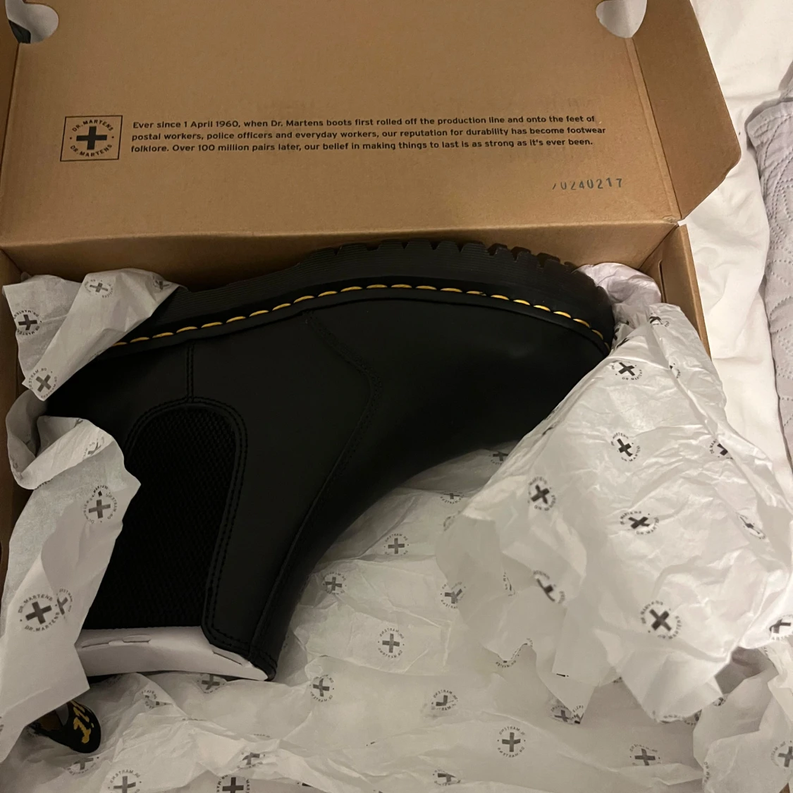 Säljer ett par klassiska svarta Dr. Martens boots med gul söm. De har en slät yta och är perfekta för en stilren look. Skorna har en robust sula och är kända för sin hållbarhet. Skorna är helt nya oanvända