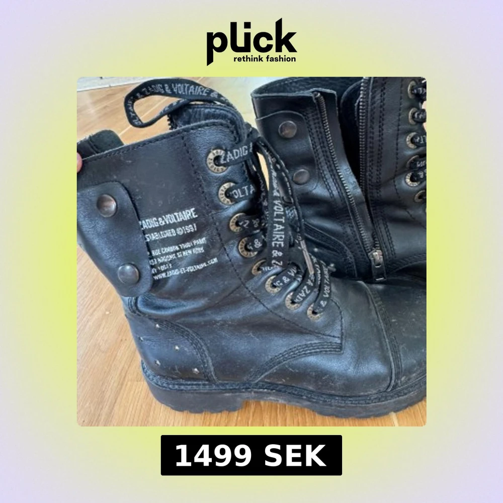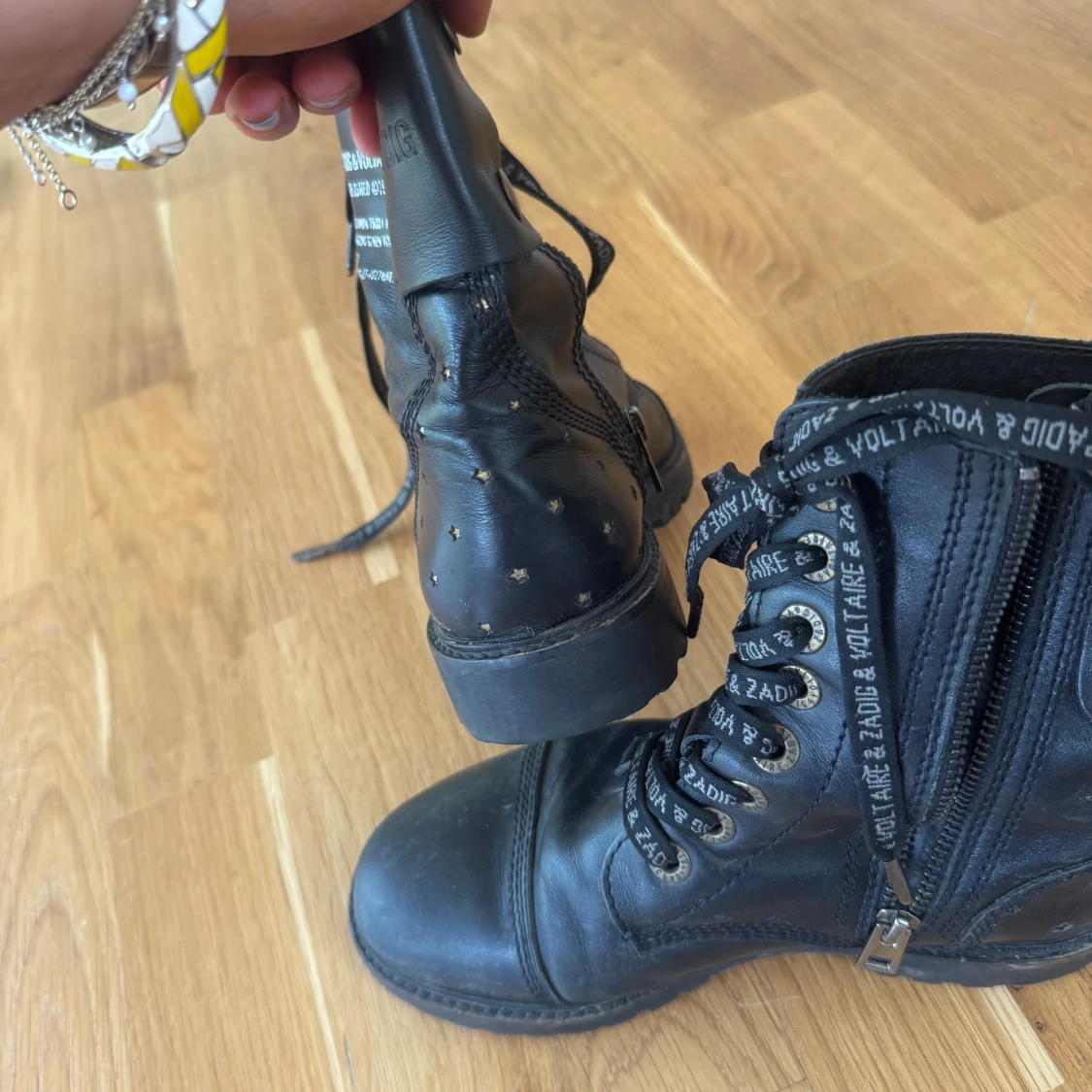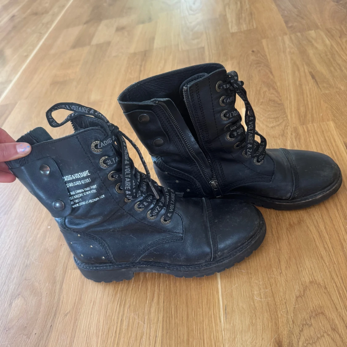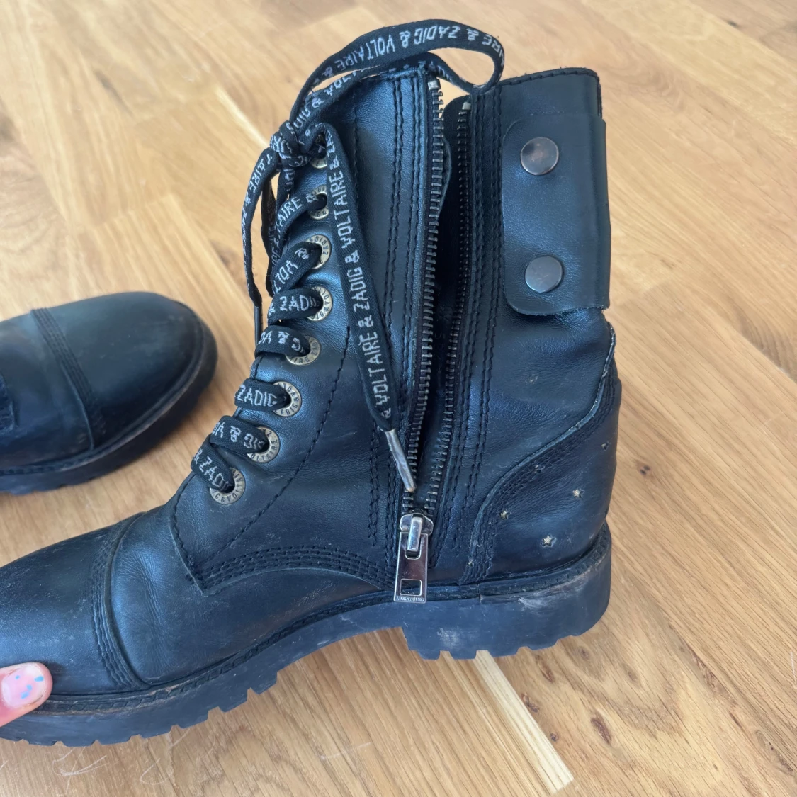 Tuffa svarta boots i skinn från Zadig & Voltaire med snörning, dragkedja på sidan och coola nitar i stjärnform baktill. Skorna har grov sula och logotyp på både snören och sidan. Perfekta för dig som gillar edgy stil.
