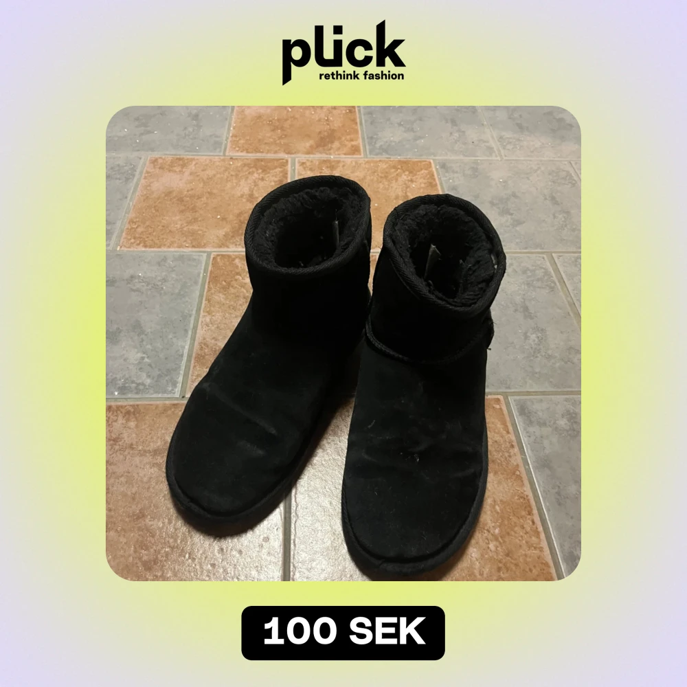 Säljer ett par svarta boots i syntetmaterial. De är perfekta för kalla dagar med sin mjuka insida. Skorna har en enkel design utan snörning eller dragkedja, vilket gör dem lätta att ta på och av. Passar bra till både vardag och avslappnade tillfällen.
