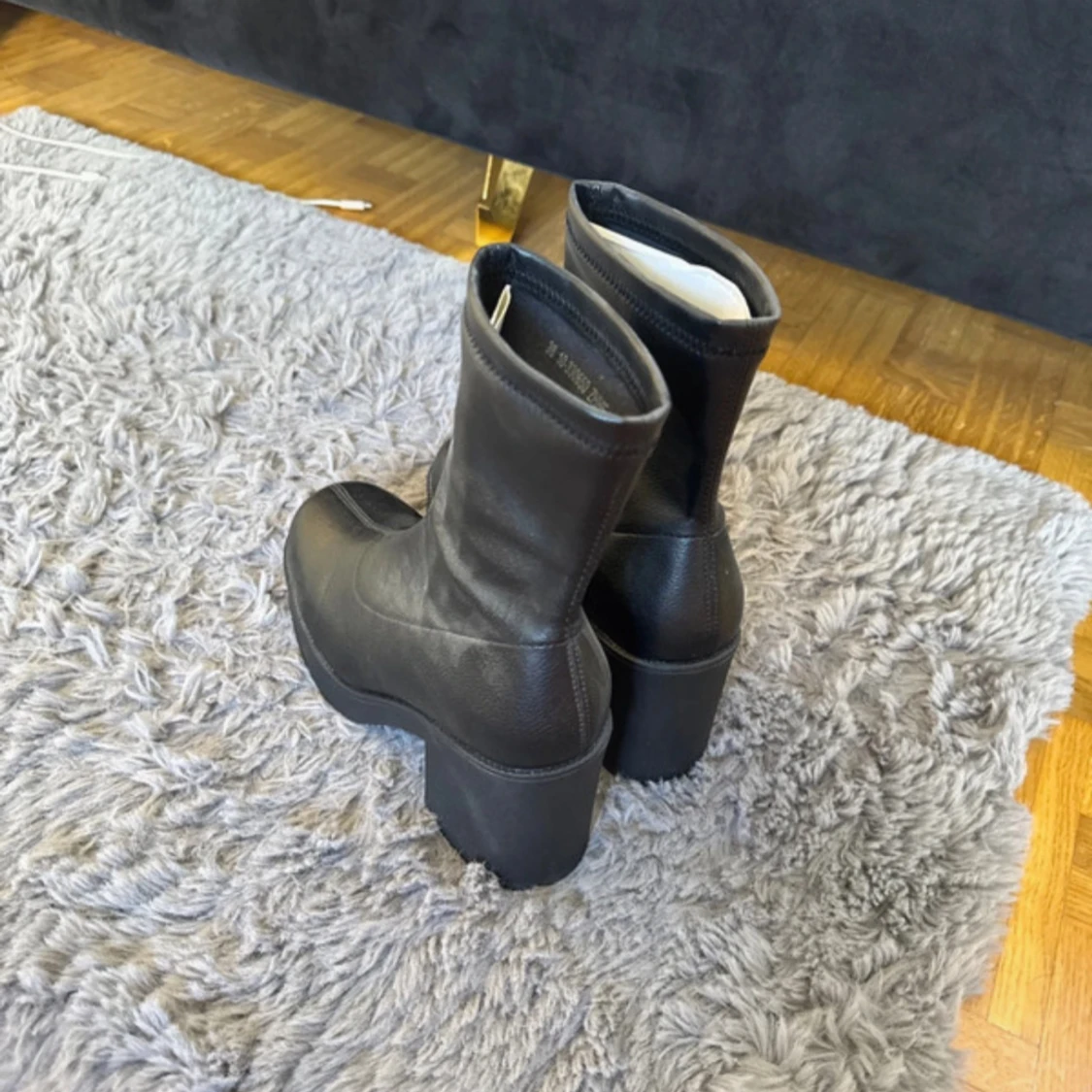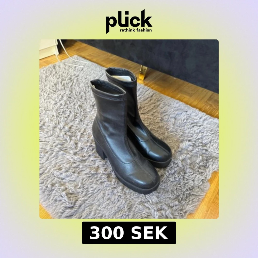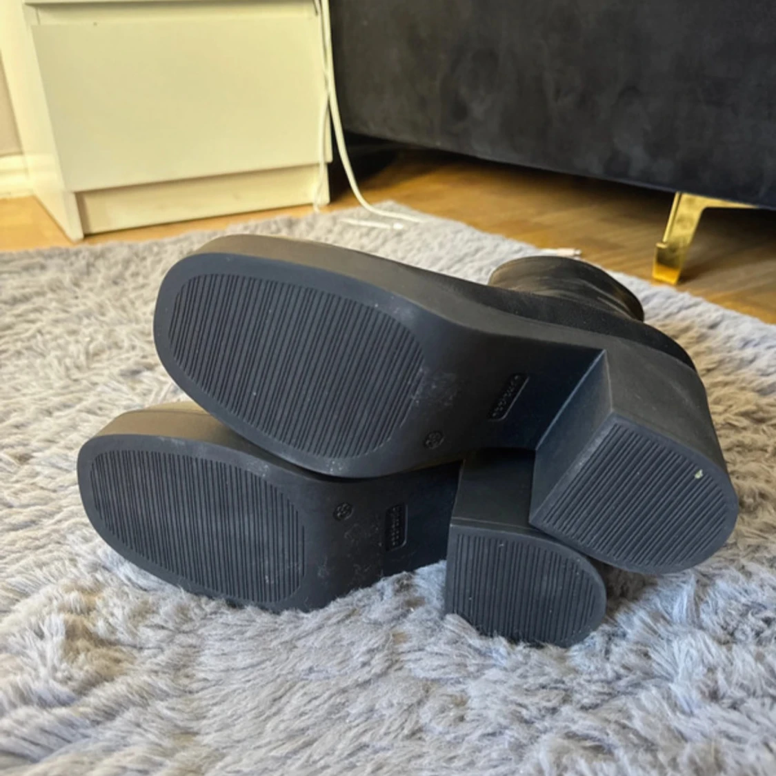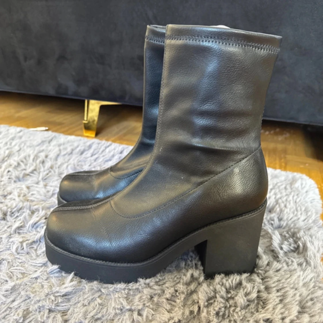 Säljer ett par svarta boots i faux skinn med hög klack och platåsula. Klacken ungefär 7cm, storlek 38, från märket Attitude. Mary Jane/hoove design.