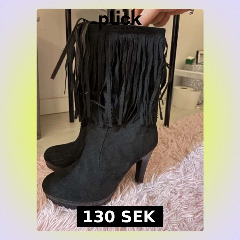Säljer ett par svarta boots med höga klackar och platt sula. Skorna har snygga fransdetaljer upptill. Dragkedja på sidan gör dem enkla att ta på. Perfekta för dig som vill sticka ut med cool western-vibe.